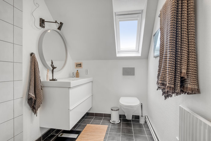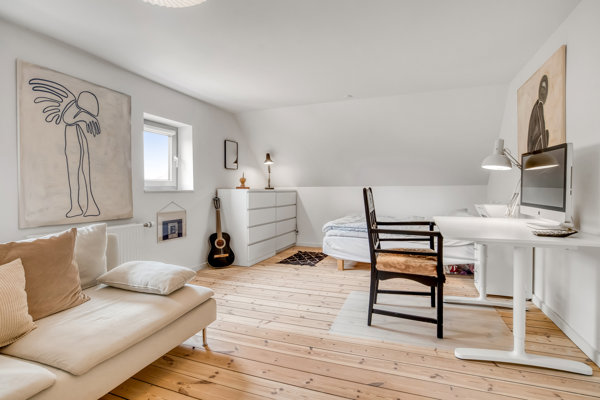 Førstesalen rummer to gode værelser med fin loftshøjde og naturligt lysindfald – oplagte som soveværelse og børneværelse eller kontor. Hertil kommer et repos med en størrelse og udformning, der gør det oplagt at anvende som ekstra areal til fx kontorplads eller overnattende gæster. Badeværelset ligger centralt placeret og byder på ovenlysvindue, væghængt toilet og moderne vaskemøbel – alt sammen holdt i en enkel og tidløs stil.