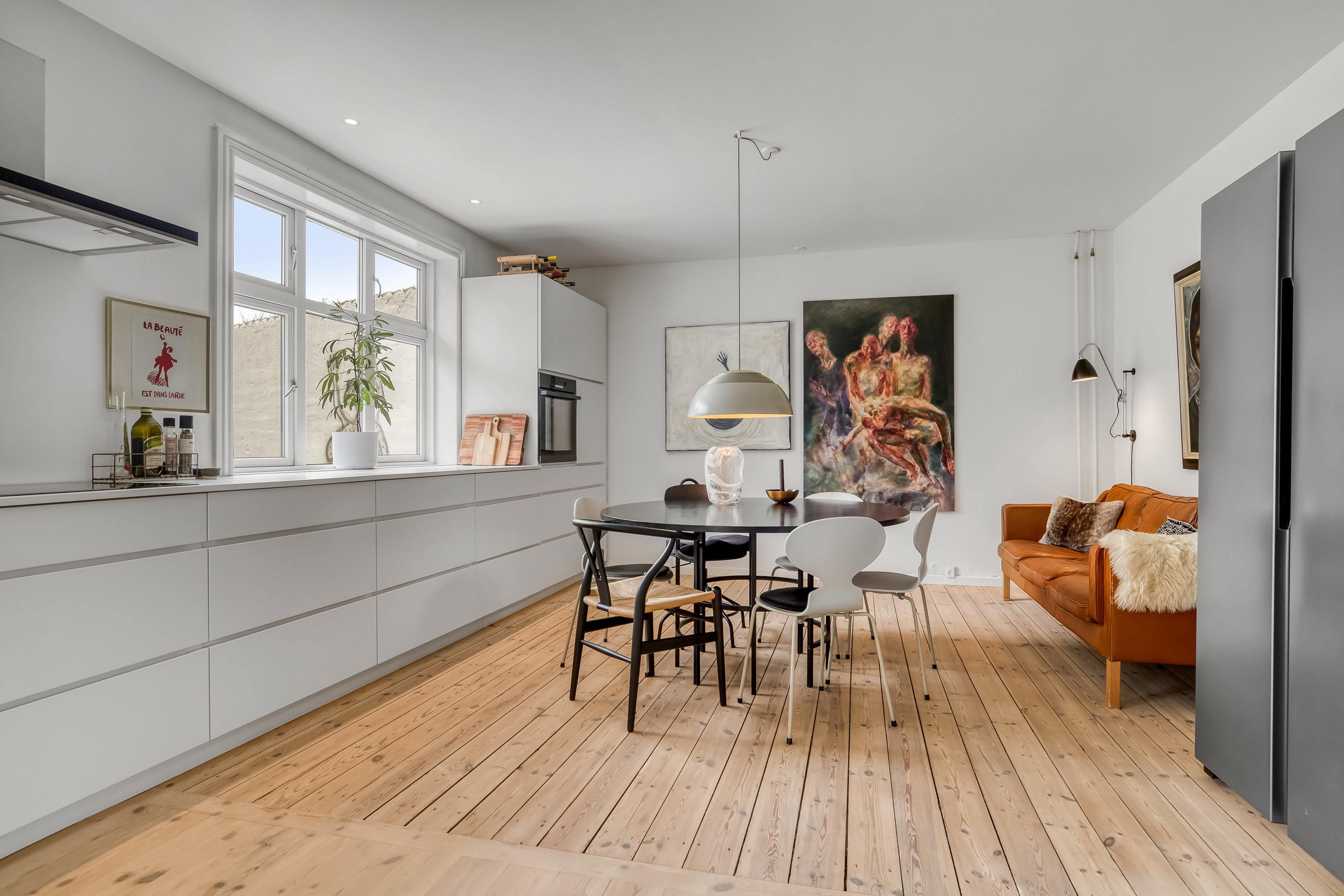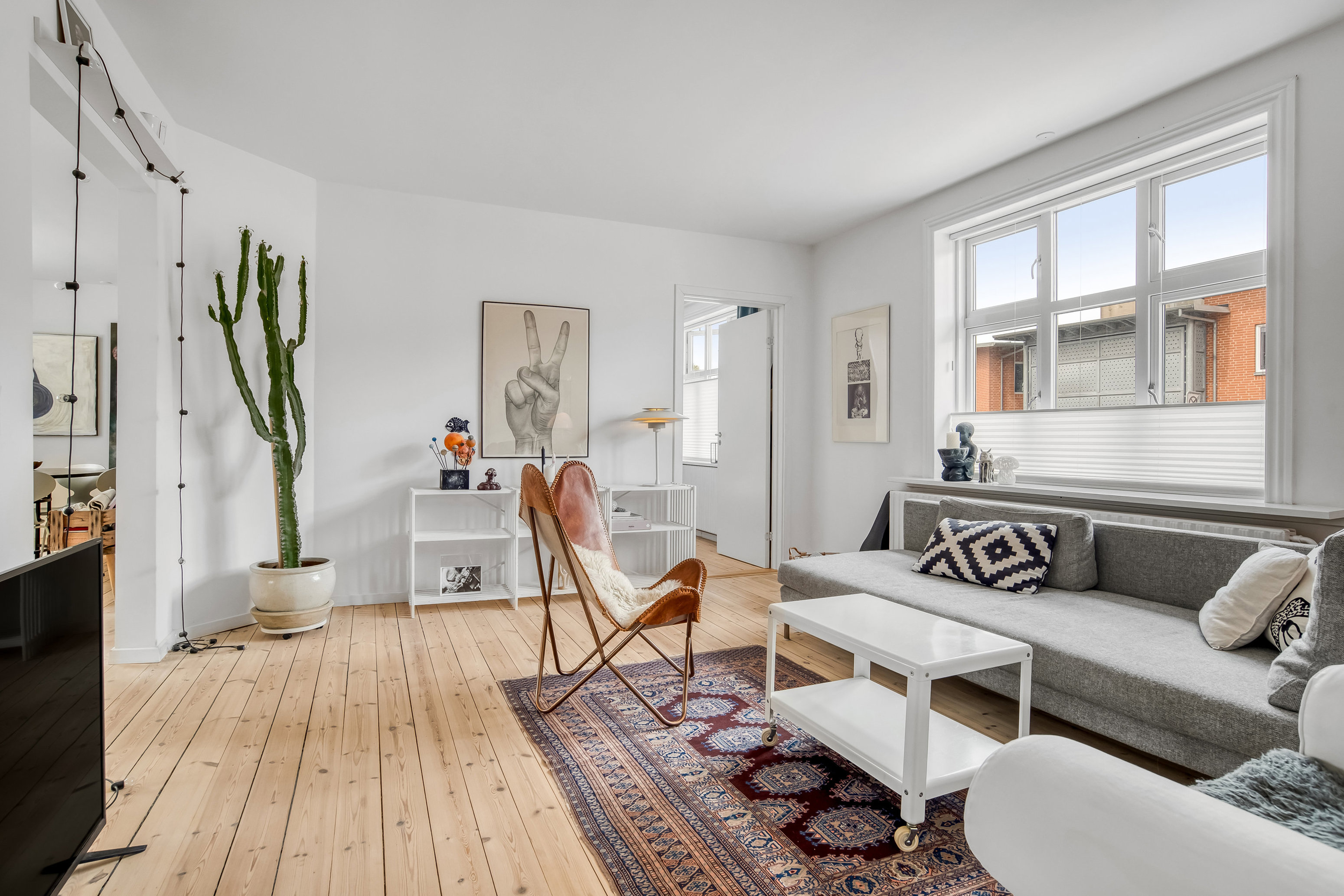 Indenfor byder boligen på i alt 139 m² fordelt på to lyse etager, der suppleres af en anvendelig kælder med mange disponible rum/værksted. Stueplanet centrerer sig om et stilrent køkken-alrum, hvor moderne hvide elementer og brede vinduer skaber en let og lys atmosfære. Her er god bordplads, spiseområde og direkte adgang til stue, hvilket gør etagen velegnet til både hverdagsliv og gæstebesøg. Opholdsstuen ligger mod syd og indbyder med en rolig stemning og god møbleringsplads. Etagen rummer desuden et værelse og et gæstetoilet i tilknytning til entréen.