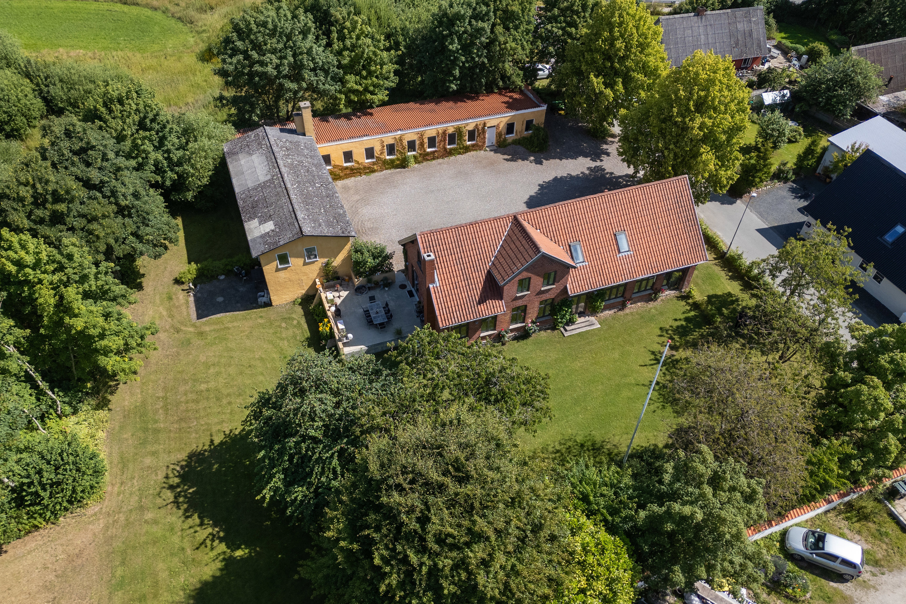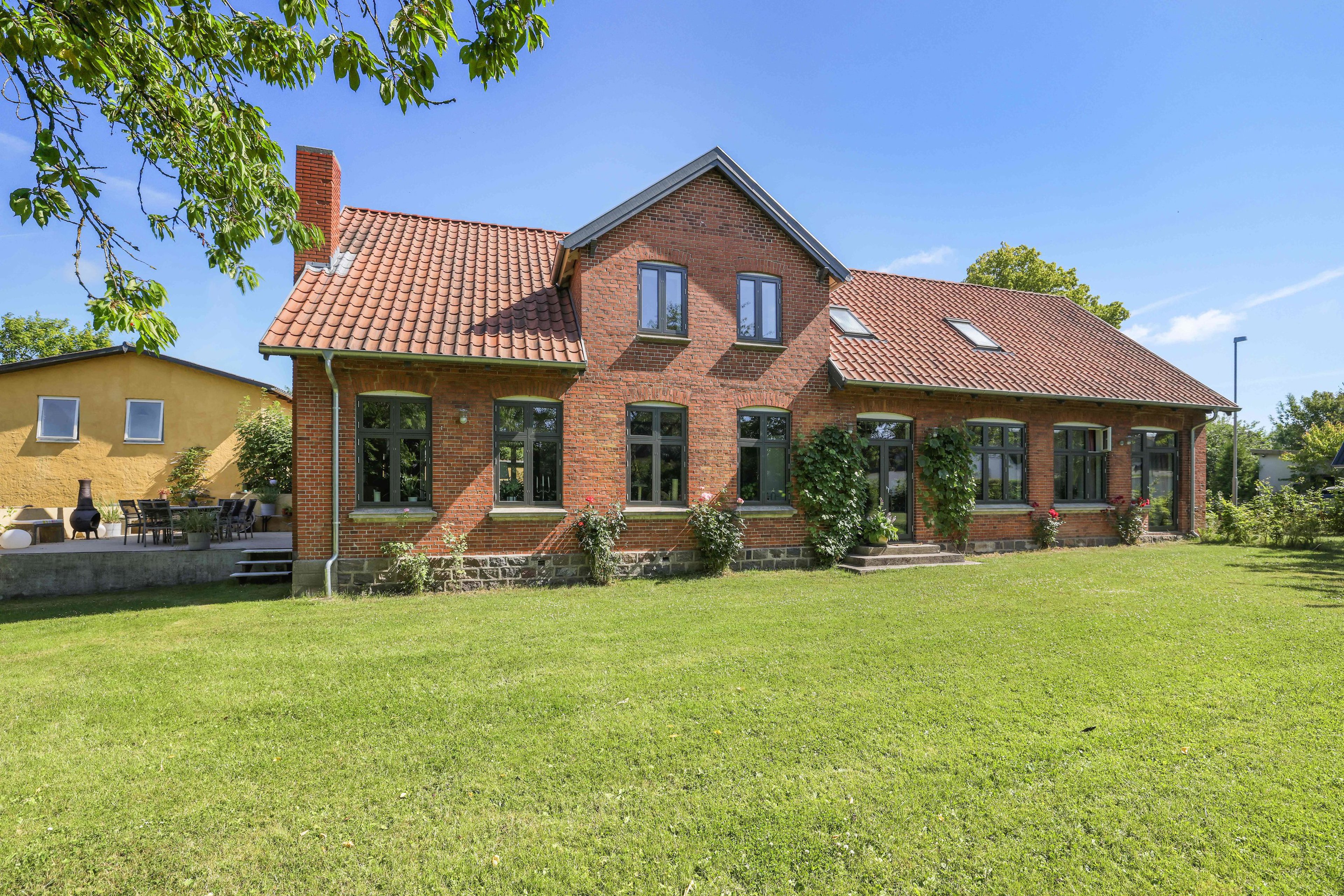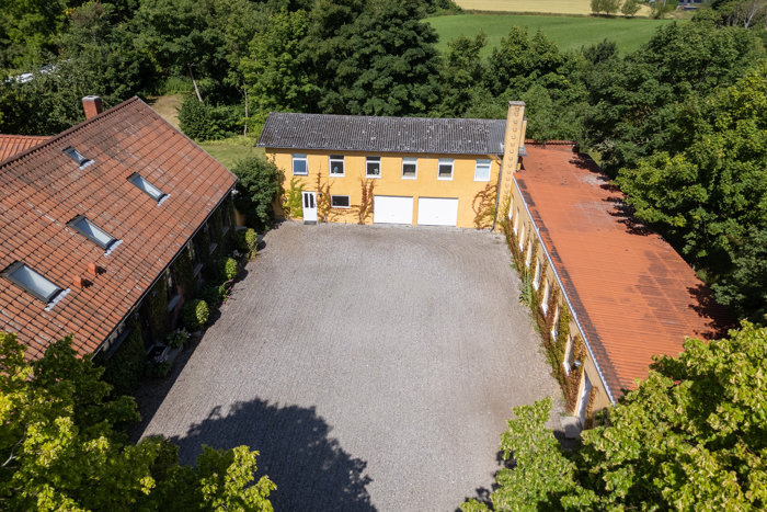 Fra første øjeblik I drejer ind på den præsentable gårdsplads, mærker I det: Her er noget særligt. Den smukke hovedbygning, flankeret af den karakterfulde mellembygning og sidebygning, danner en indbydende og harmonisk helhed - et hjem med historie, identitet og varme. Ejendommen, der oprindeligt blev opført som landsbyskole omkring år 1900, har gennemgået en kærlig og respektfuld forvandling. I dag fremstår den som en arkitektonisk perle, hvor historiske detaljer og moderne komfort smelter sammen i en sjælden grad af kvalitet og autenticitet. Den tidligere skole og den gamle træskofabrik er nu forvandlet til en rummelig, personlig og eventyrlig bolig med masser af sjæl og potentiale - ideel til storfamilien, flere generationer, hjemmeerhverv eller som kombineret bolig- og udlejningsejendom. Den tilhørende grund på hele 3.190 m² indrammer ejendommen på smukkeste vis og danner en grøn oase med høje træer, solrig plæne og en vidunderlig hævet terrasse, hvor I kan nyde udsigten til haven. I haven er der plads til f.eks. drivhus, urtehave, børneleg og afslapning i fredelige omgivelser.
