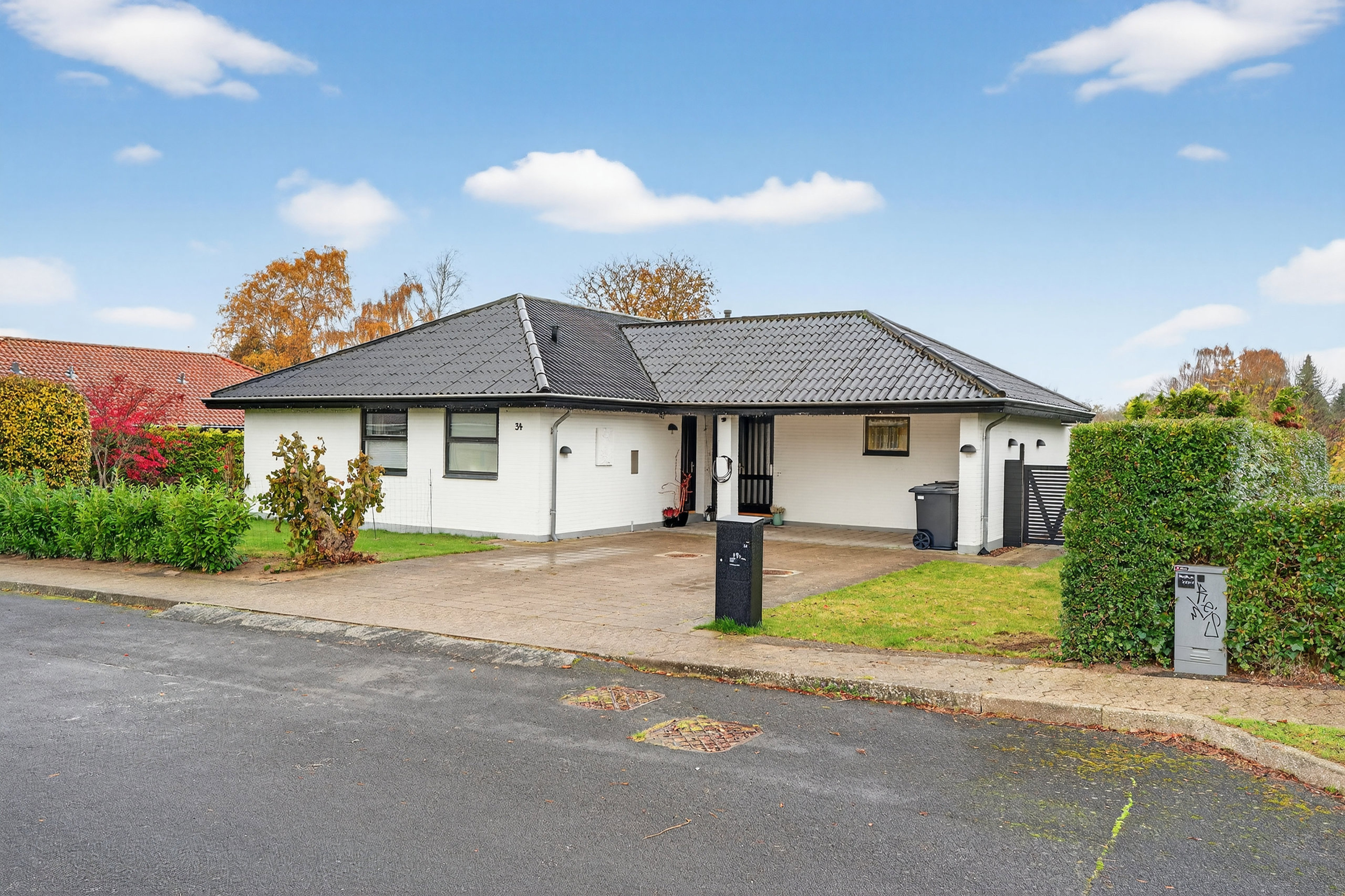 Boligen præsenterer sig klassisk med valmet tag, carport og en pæn forhave – et hus, der allerede udefra