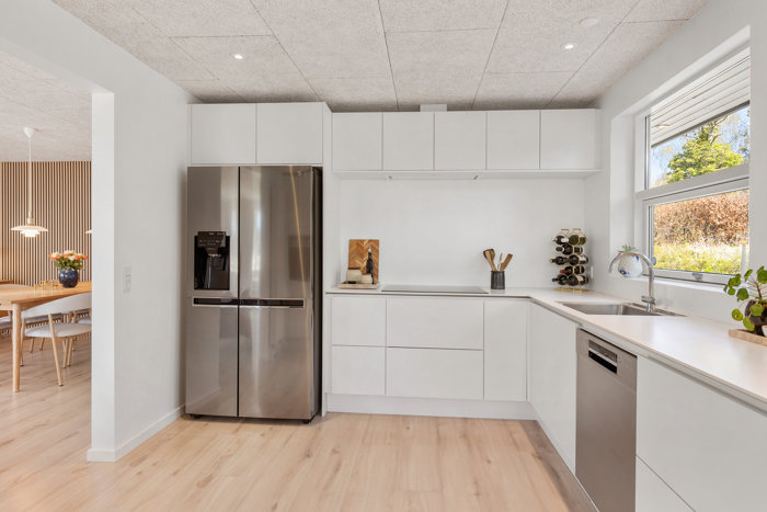 Opholdsrummene er åbne og velfungerende med køkken og stue i forlængelse af hinanden. Stuen er rummelig og indretningsvenlig med plads til både spisebord og sofaområde, og her opleves udsigten som en naturlig del af rummet med et flot kig mod søen. Herfra er der desuden direkte udgang til terrassemiljøet. Terrassen er i sig selv et kapitel. Med en stor træterrasse, der smyger sig omkring huset, får du flere opholdszoner – både overdækkede og åbne – så du kan følge solen dagen igennem og samtidig nyde den åbne udsigt over området og mod søen.