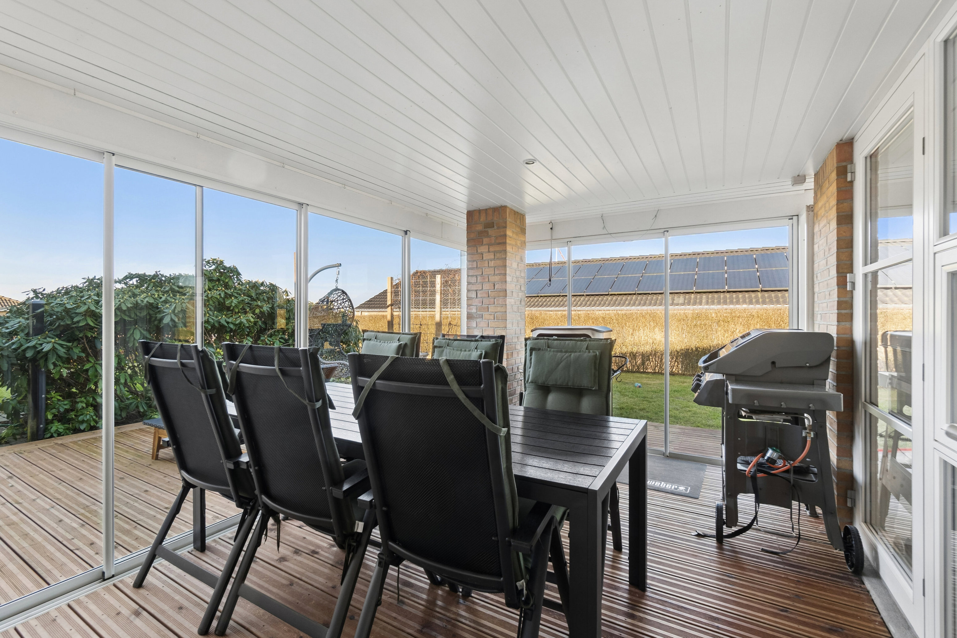 Fleksibel planløsning med mulighed for etablering af ekstra værelse samt skøn overdækket terrasse, som kan lukkes med skydbare glaspartier - med direkte adgang fra stue og køkken/alrum skaber det en naturlig udvidelse af boligens opholdsmiljø. Glaspartierne kan åbnes op om sommeren, og rummet giver mulighed for at anvende blandt andet grill og pizzaovn året rundt.