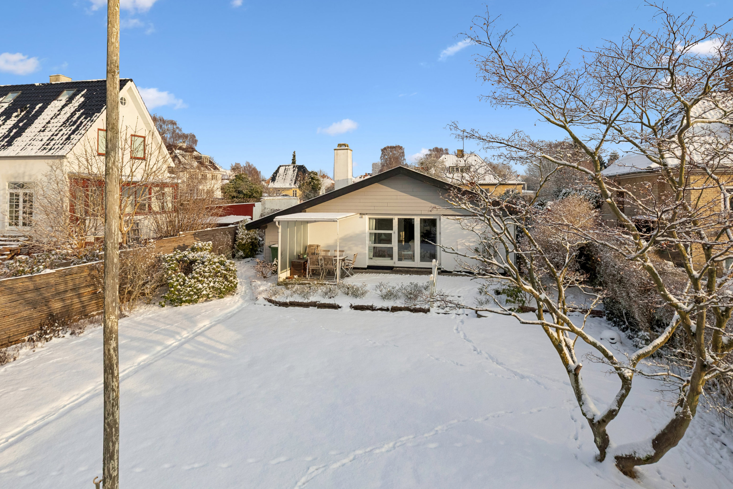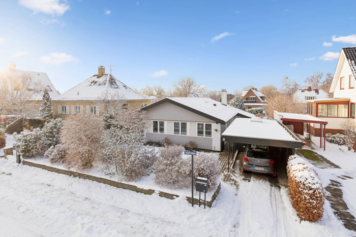 Udenfor fortsætter den gode stemning med tør parkering i carporten, tilhørende skur og en skøn have, hvor I kan følge solen dagen igennem. Nyd morgenkaffen i den velbeplantede forhave, og lad aftenerne slutte på den store fliseterrasse i baghaven. Terrassen er delvist overdækket, så udelivet kan nydes i al slags vejr, mens den store, åbne plæne giver god plads til leg, boldspil og afslapning.
