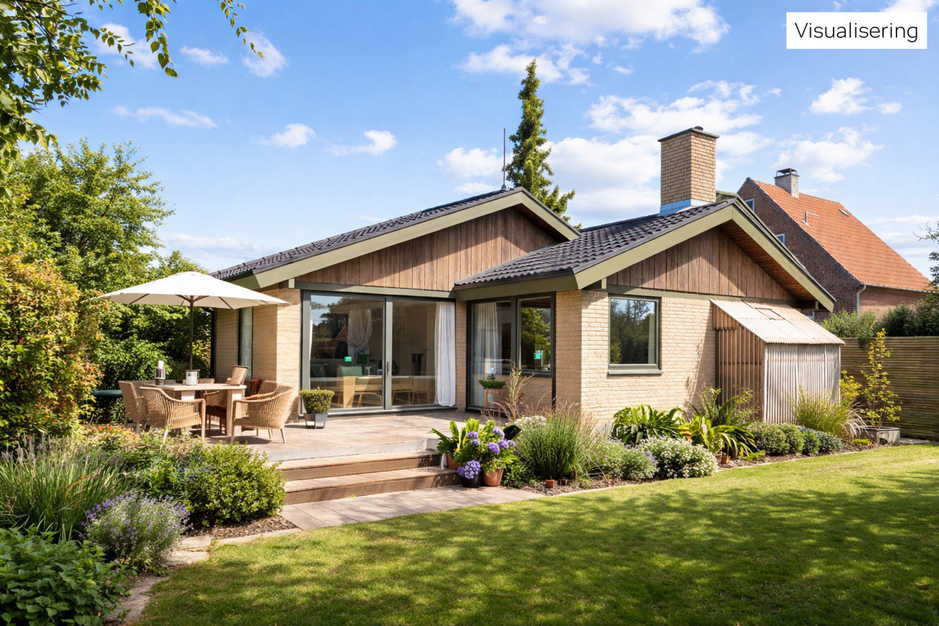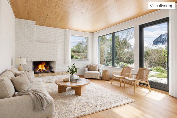 Hjemmet fuldendes af et spisekøkken og en rummelig vinkelstue, hvor en muret pejs tilfører rummet charme, mens de mange store vinduespartier lukker lyset ind og giver udsigt til haven. Køkken og stue støder op til hinanden, så hvis I drømmer om et moderne køkken-alrum, kan I overveje at åbne op til ét stort leverum. Fra stuen træder I også direkte ud til sol og sommer på den sydvendte terrasse i en hyggelig have, der er overskuelig i størrelsen.