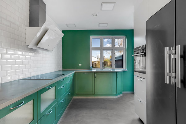 Køkkenet skiller sig ud med sin grønne farvesætning, der spiller flot sammen med hvide metrofliser og enkle fronter. Udtrykket er moderne og gennemtænkt, og den gode bordplads giver fine arbejdsvilkår til både hurtige måltider og større madprojekter. Materialerne er valgt med fokus på praktik og æstetik, så rummet er rart at opholde sig i.
