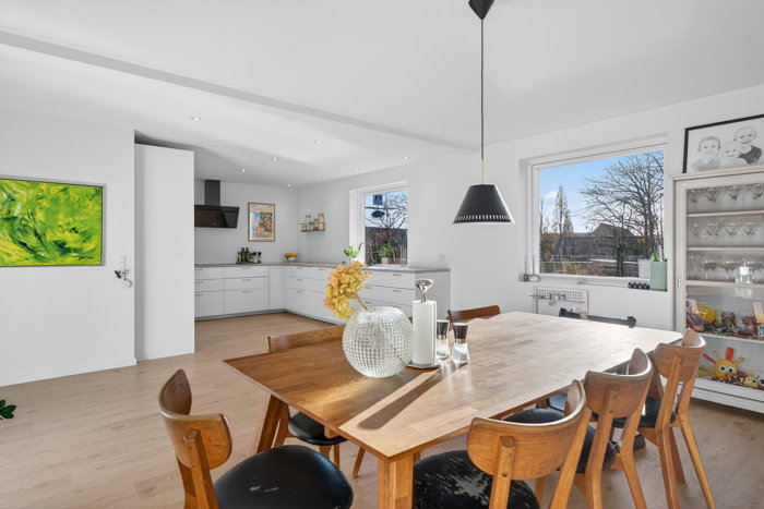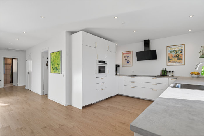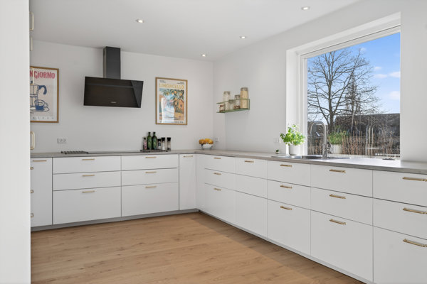 Fire værelser er et godt udgangspunkt for de fleste familiestørrelser, og dertil får I både et gæstetoilet og et pænt, lyst badeværelse. Især opholdsrummene har haft udpræget gavn af den grundige renovering af boligen, hvor en væg er blevet fjernet for at skabe bedre sammenhæng i køkken-alrummet. Køkkenet er stilrent med hvide elementer og gyldne greb, og der er prioriteret lækkerier som en ekstra bred induktionskogeplade samt app-styret pyrolyseovn med airfryer. Den skønne stue knytter sig naturligt til det store alrum, og her har man installeret en større havedør, så lysindfaldet er markant forbedret.