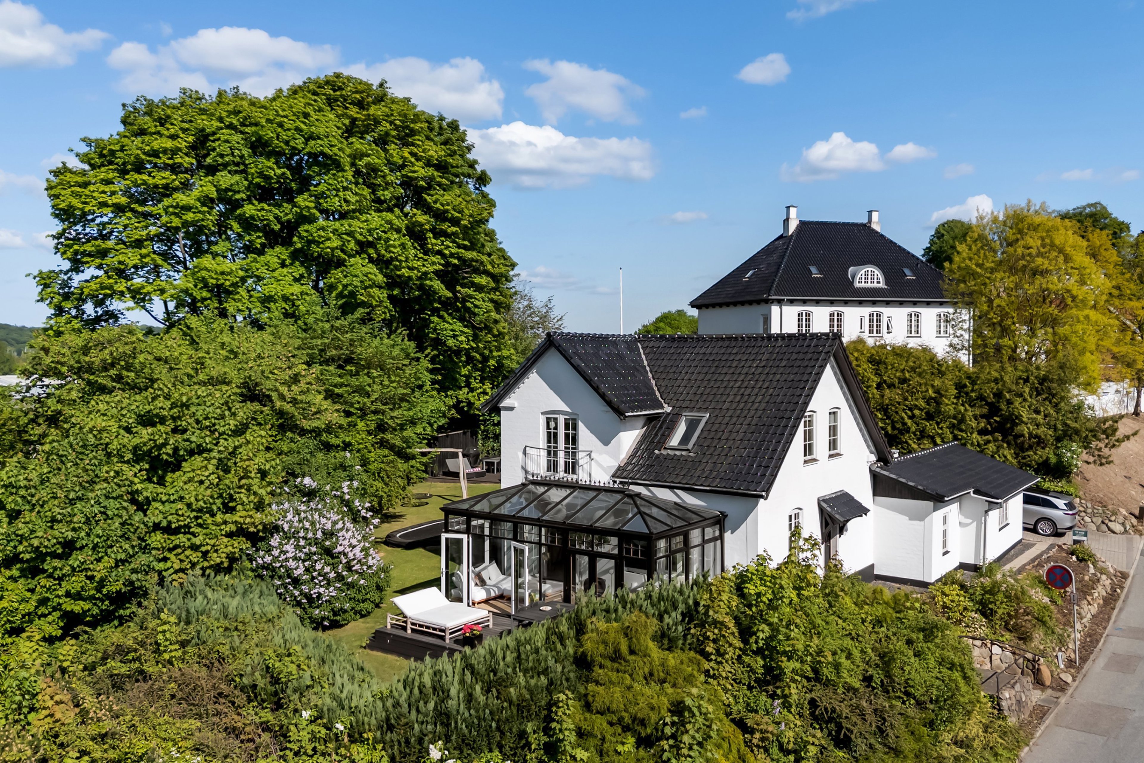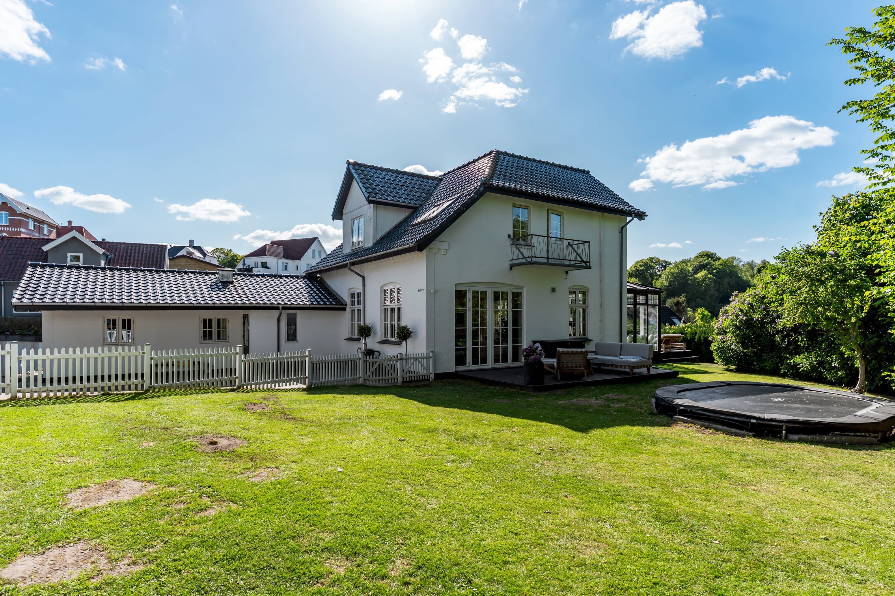 Huset har unikke solforhold med hele 3 terrasser der giver mulighed for udeliv fra morgen til aften. Den største terrasse har rigelig plads til at hele familien kan grille på en sommeraften. På terrassen finder du også et stort og helt privat udendørs spabad. En stor del af haven er omkranset af gamle træer og store grønne buske der understreger det ugenerede miljø.