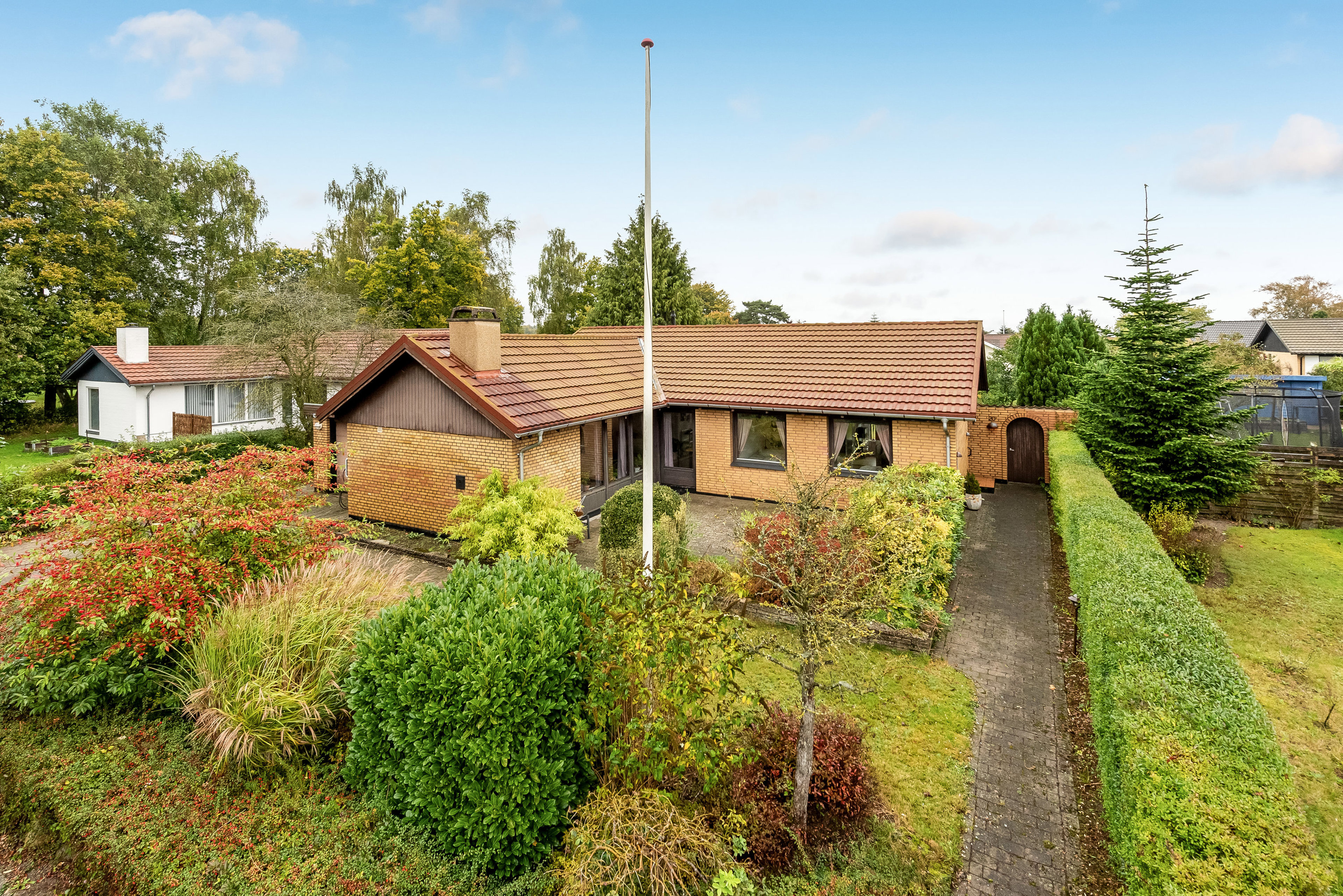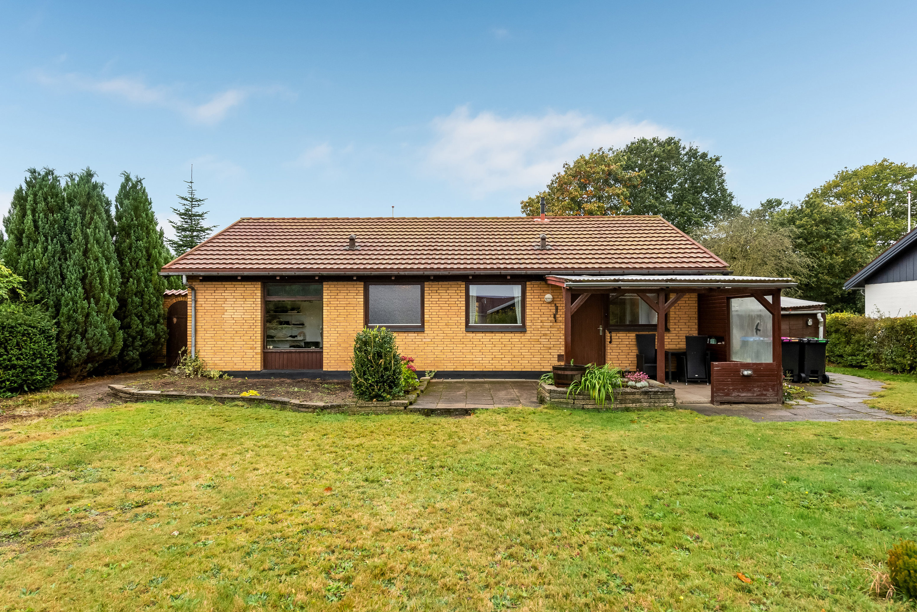 Udenfor finder vi en fin garage med integreret skur, som giver gode opbevaringsmuligheder og plads til både cykler, værktøj og haveredskaber. Udenfor venter en dejlig, overskuelig have med grønne rammer og god plads til leg og afslapning. Der er både en overdækket terrasse og en åben terrasse på hver sin side af huset, så man altid kan finde en plads i solen eller læ for vinden.