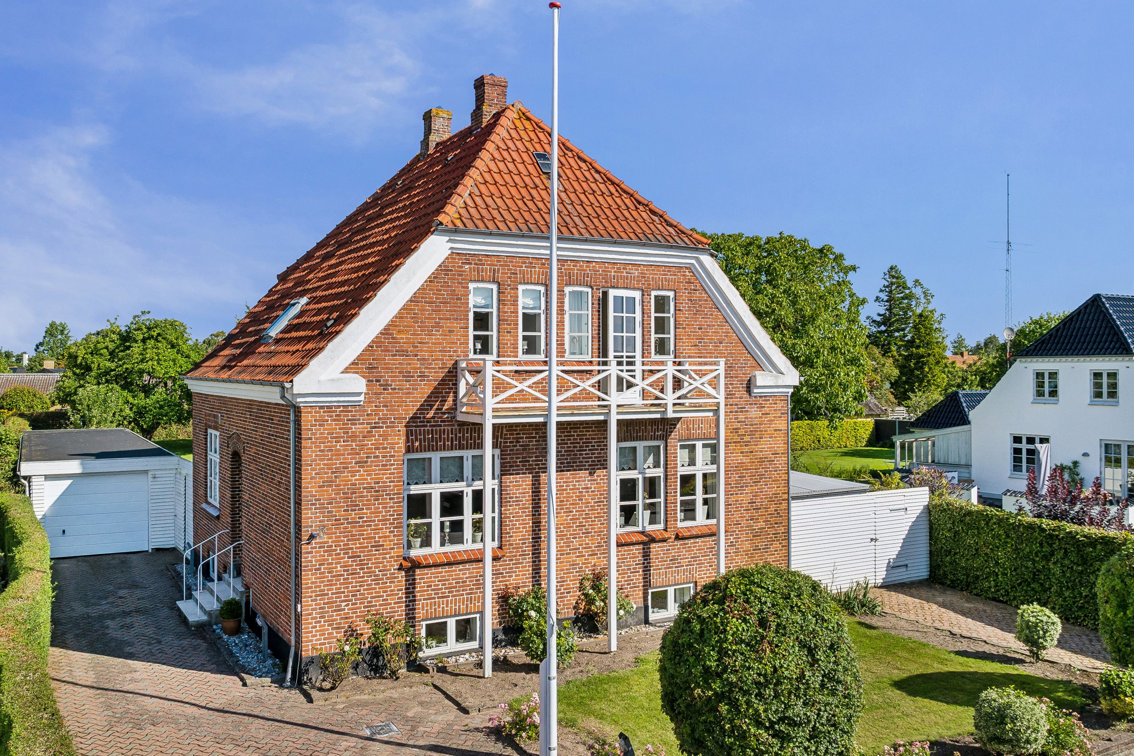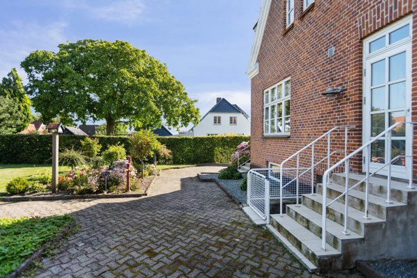 Hele herligheden er beliggende på en 1.104m² stor grund, hvor vi ankommer til en rummelig flisebelagt indkørsel. Der findes endvidere flere praktiske udhuse på grunden, med alverdens anvendelsesmuligheder. Desuden hyggelige terrasser og solkroge, enkelte bede og træer.