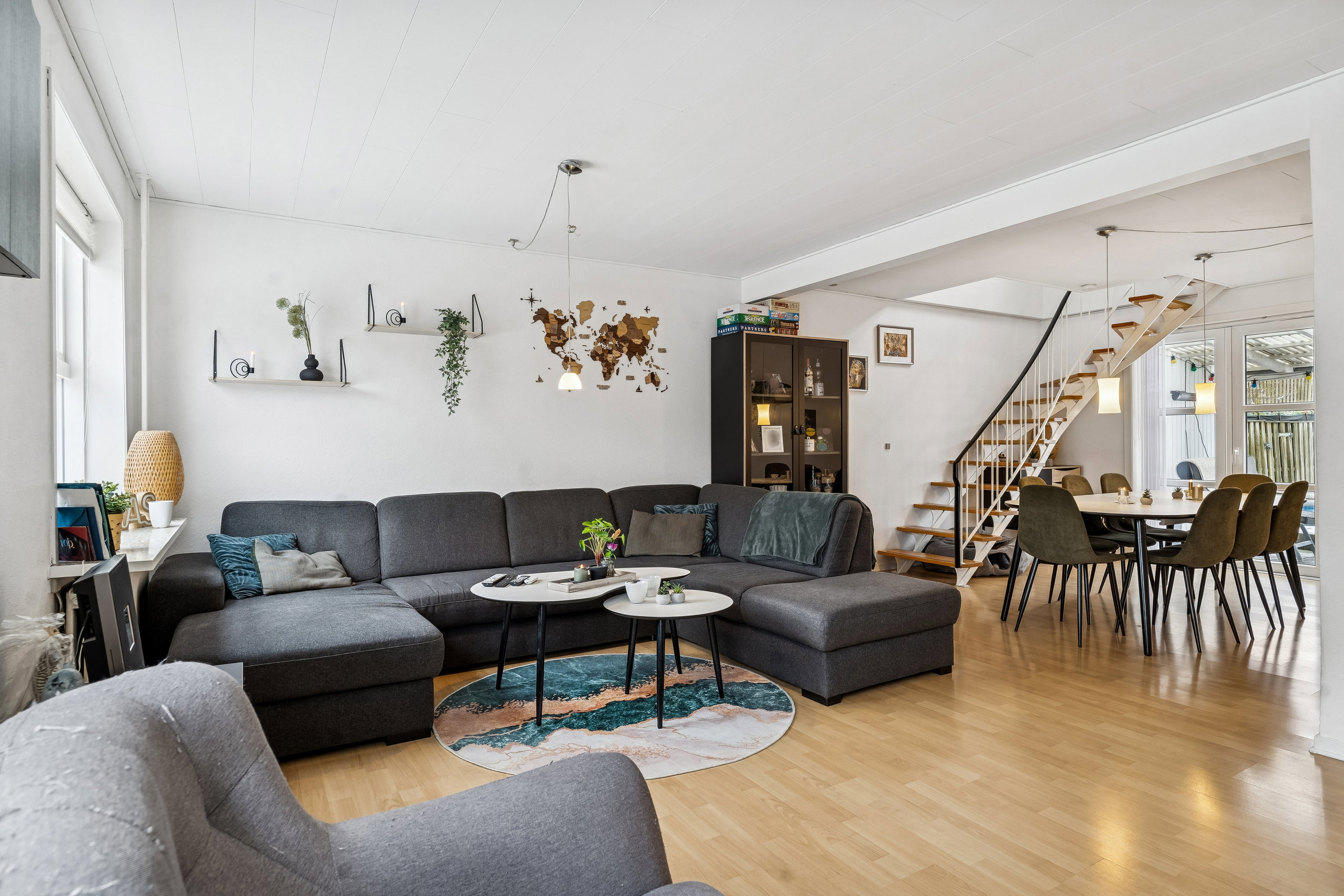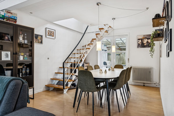 I stueplan bydes I velkommen i entréen med plads til overtøj. Herfra er der adgang til køkkenet, som er indrettet med god skabs- og bordplads samt spiseplads til hverdagen. Køkkenet ligger i åben forbindelse med boligens opholdsrum, hvor stue og spisestue samler familien. Rummet er regulært og nemt at indrette med både sofaafdeling og spisebord, og de dobbelte døre mod terrassen skaber en fin overgang mellem ude og inde. I stueplan findes desuden et gæstetoilet med vaskesøjle. På 1. sal fordeler en rummelig repos boligens værelser. Her er to store og regulære værelser med gode indretningsmuligheder samt et mindre rum, der egner sig oplagt som kontor, walk-in-closet eller praktisk opbevaring. Badeværelset på førstesalen fremstår pænt og lyst med bruseniche og moderne inventar. Planløsningen er ideel til både parret, den lille familie eller jer, der ønsker et ekstra rum til hjemmearbejde.