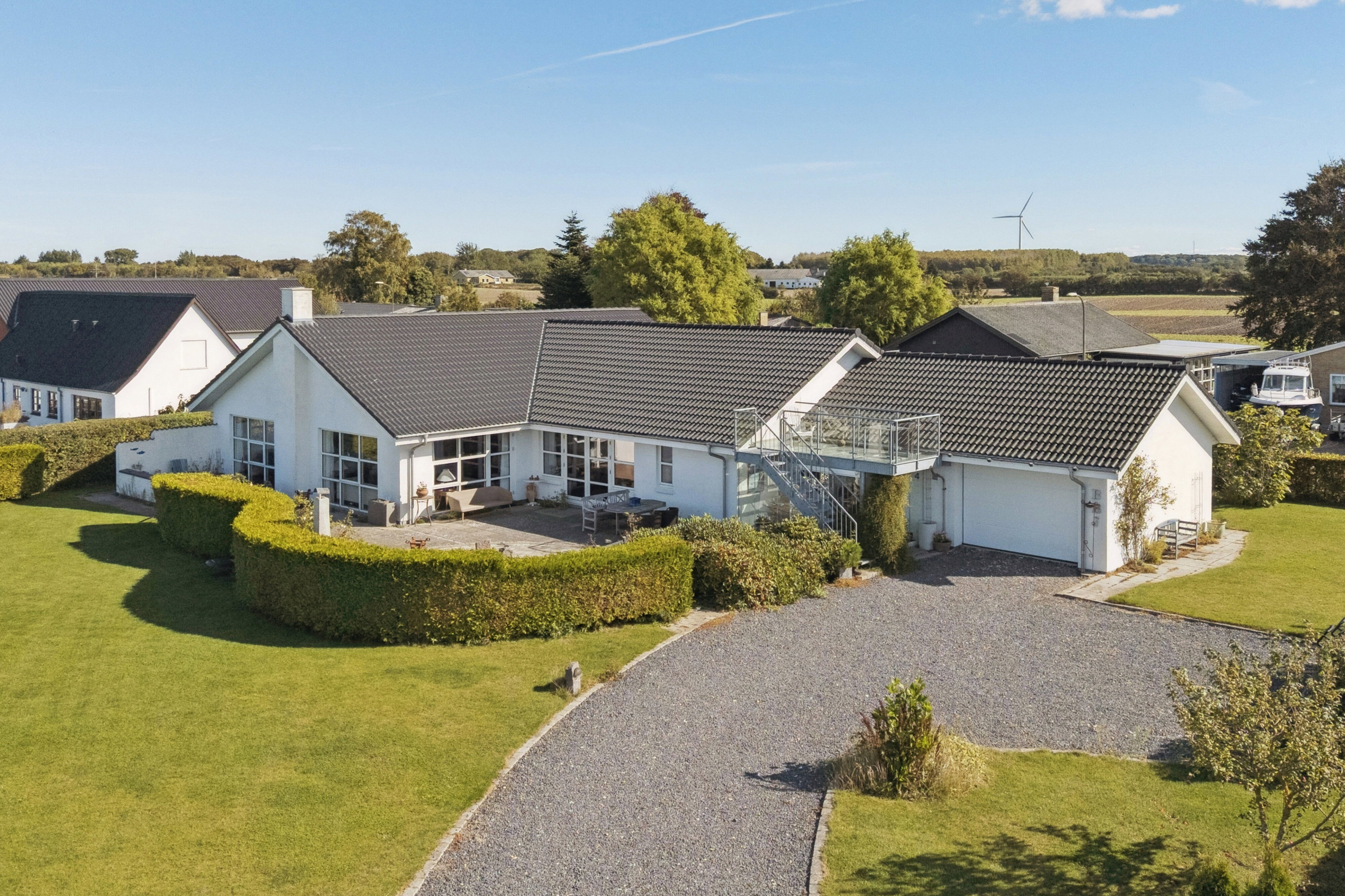 Haven er anlagt med samme sirlighed, som huset er bygget med. Forholdene er fortrinlige, og I har blandt andet fornøjelsen af en let hævet terrasse, hvorfra udsigten er allerbedst. Den integrerede dobbeltgarage skal også fremhæves.