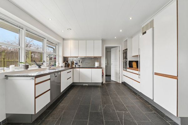 Villaen blev bygget i 2009, og den fremstår ude om inde med et skarpt udtryk. I midten af boligen råder I over to store opholdsrum, nemlig alrummet og stuen, og for begge parter gælder det, at lysindfaldet er ganske henrivende. Køkkenet i alrummet toner frem med et enkelt design i form af toner hvide, glatte fronter