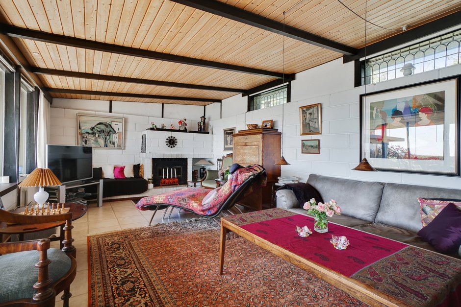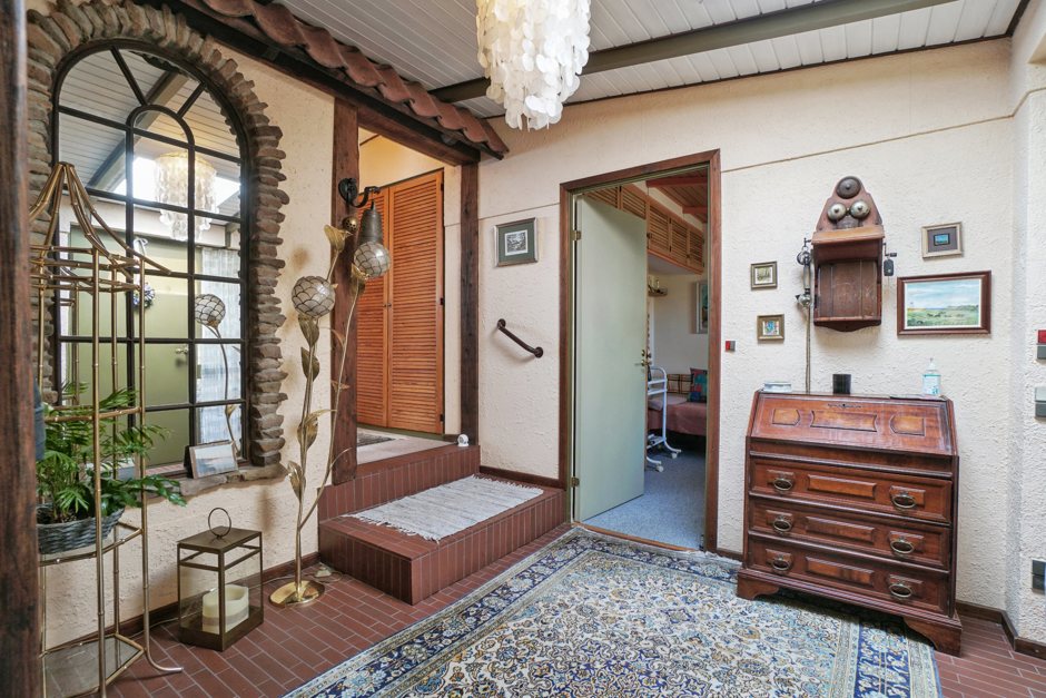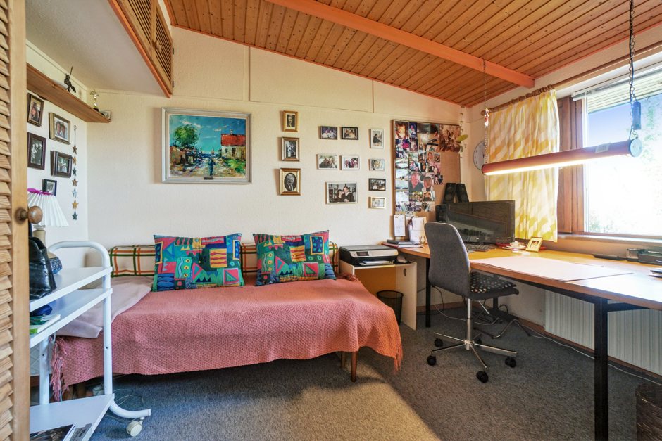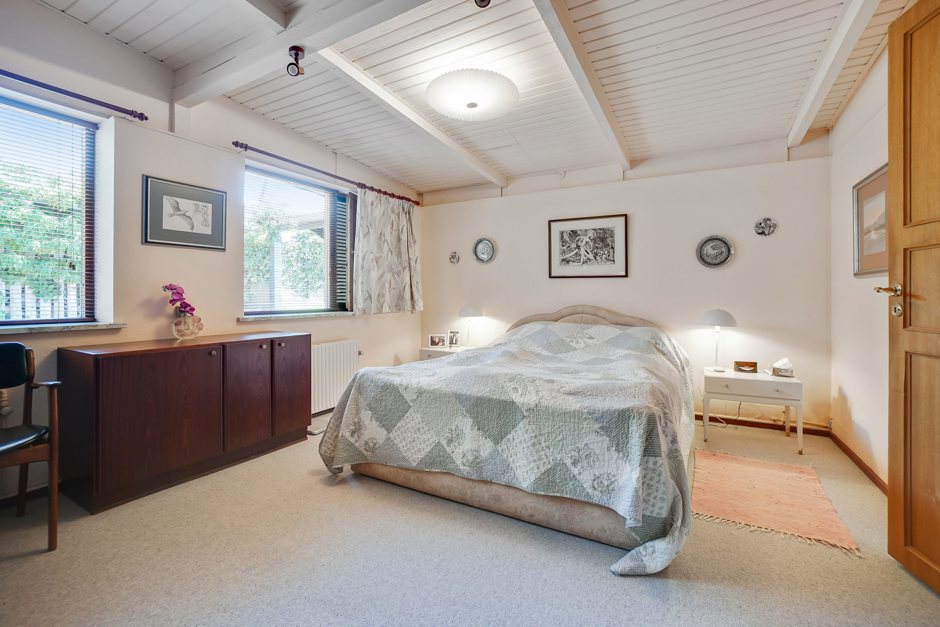 Stuen imponerer med sit smukke lysindfald og en naturlig rummelighed, der understreges af pejsen — et elegant samlingspunkt på kølige aftener. De tre værelser byder på fleksible indretningsmuligheder, og ét af dem har endda adgang til eget toilet. Hertil kommer et pænt badeværelse med bruseniche.