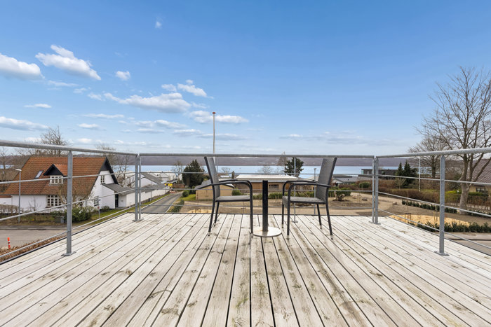 Udendørs venter en hyggelig have samt en god garage. Den hævede terrasse fra 2018 – etableret i forbindelse med nyt tag – er et af ejendommens helt store aktiver, hvor I kan nyde udsigten til vandet i rolige omgivelser.