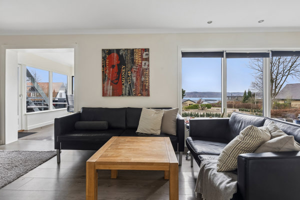 Hjemmets naturlige samlingspunkt er den lyse stue, som ligger i åben forbindelse med køkkenet. Her skaber store vinduespartier et dejligt lysindfald og en behagelig atmosfære, samtidig med at der er kig til vandet. Fra stuen er der direkte adgang til en udestue, som fungerer som en skøn forlængelse af opholdsrummet – perfekt til de lange sommeraftener.