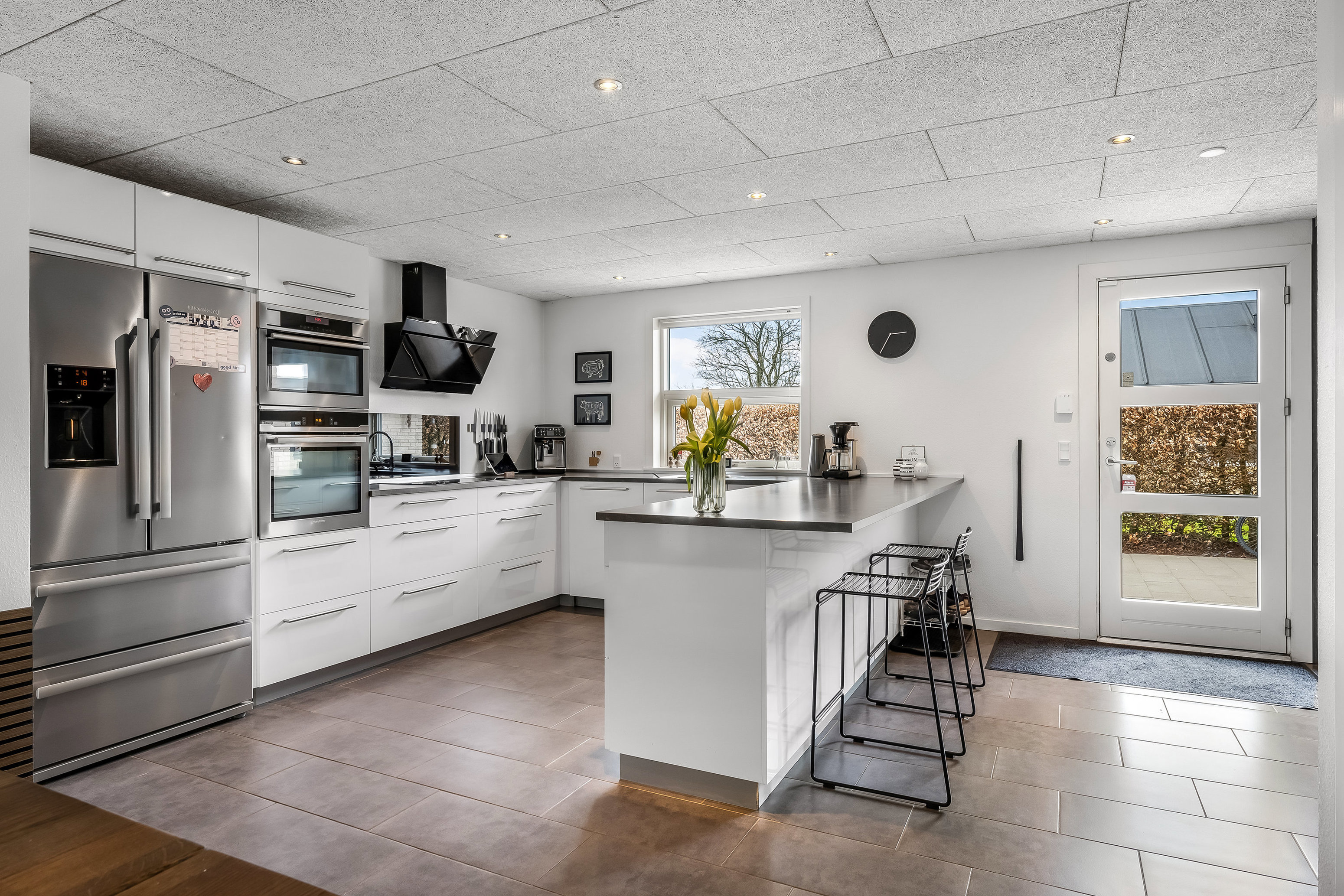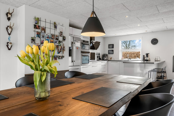 Boligen byder på hele 150 m² bolig og fremstår særdeles indbydende. Taget er udskiftet i 2012, og vinduerne er ligeledes skiftet, hvilket bidrager til både komfort og et lavere energiforbrug. Husets naturlige samlingspunkt er det lyse og rummelige køkken-alrum, hvor gulvvarmen skaber en behagelig atmosfære året rundt. Her er god plads til både hverdagsliv og gæster, og alrummet ligger i åben forbindelse med opholdsstuen, som har et dejligt lysindfald og direkte udgang til terrasse og udestue.