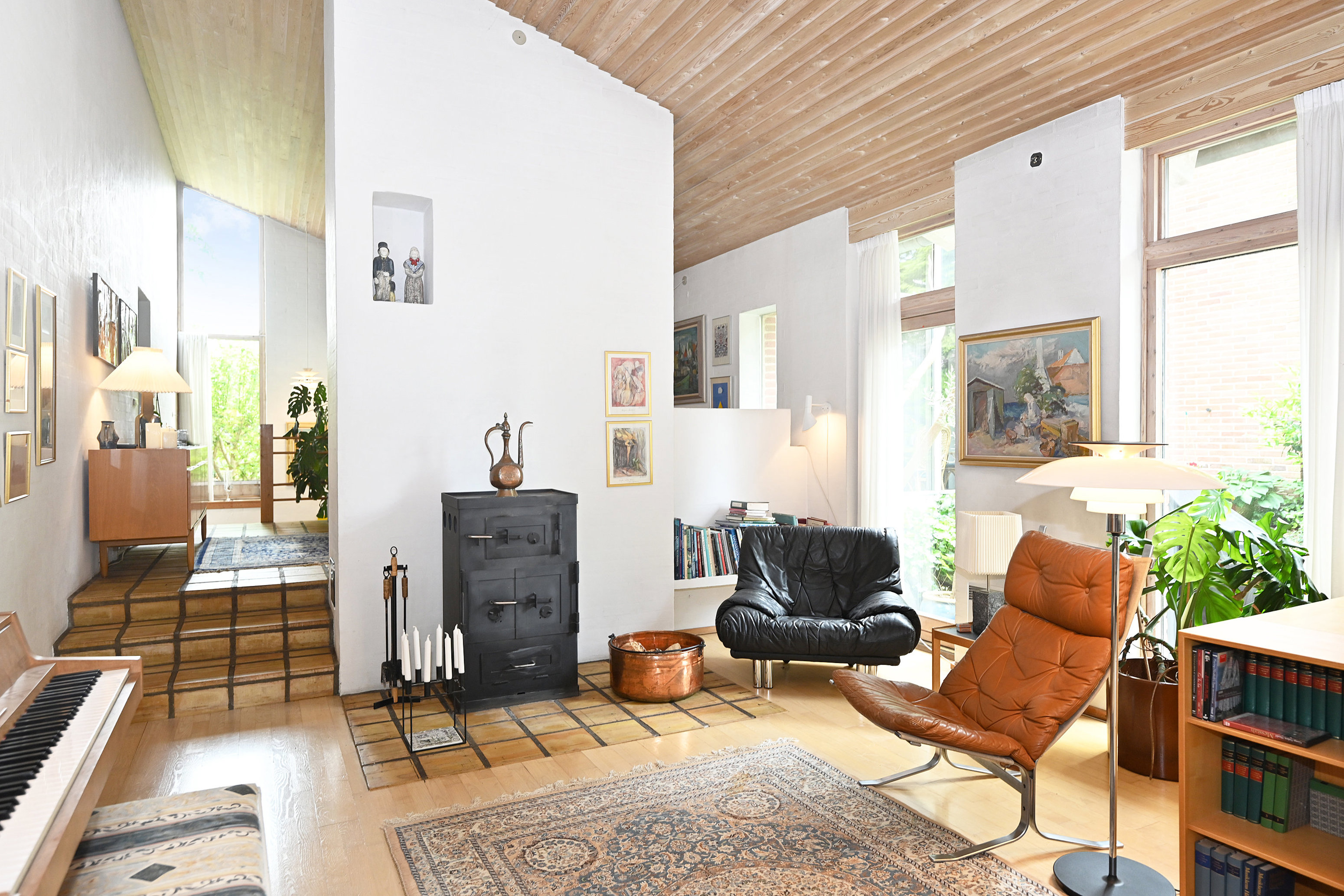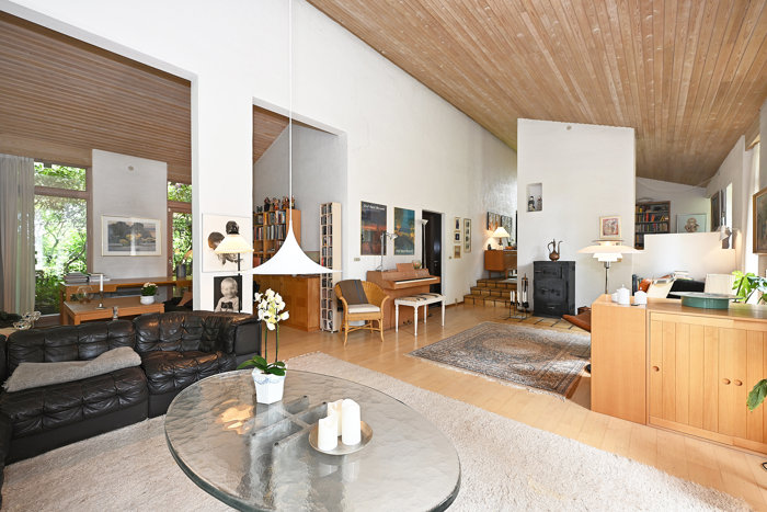 Stueplan er i niveauforskudte plan med i alt 5 dejlige soveværelser samt et imponerende køkkenalrum med vinduer fra gulv til loft og smuk udsigt til haven og terrassen. Stuen er lige så imponerende med cirka 6 meter til loftet, gennemgående pejs mellem spisestue og dagligstue samt åbent til biblioteket / tv-stuen. Badeværelserne er med oprindelige VOLA-armaturer i flotte farver og alt fremstår i super god stand.