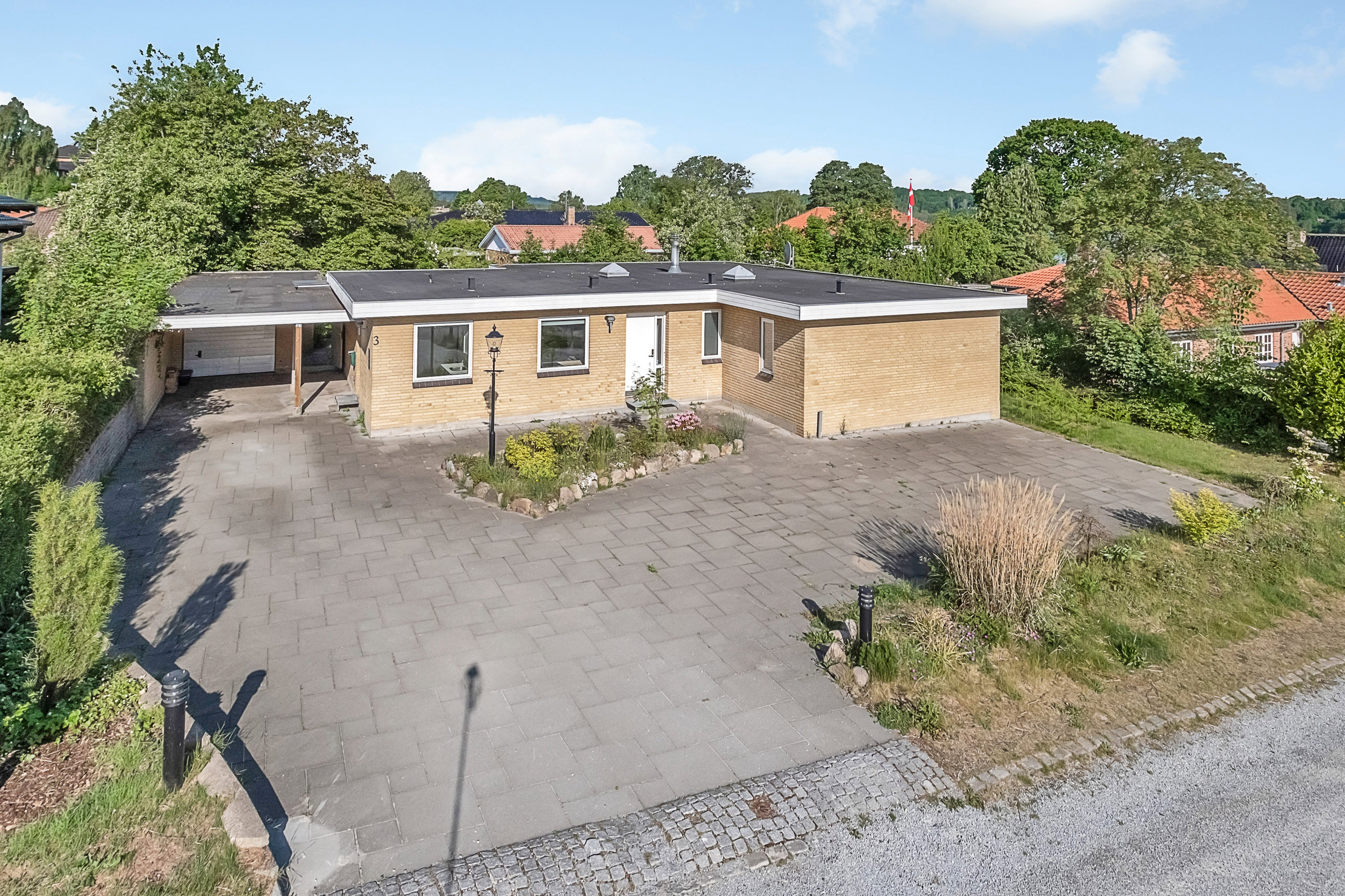 Udenfor venter en stor indkørsel med god plads til både egne og gæsters biler, samt en fin forhave og adgang til en rummelig garage på hele 55 kvadratmeter – ideel til både bil, værksted og ekstra opbevaring.