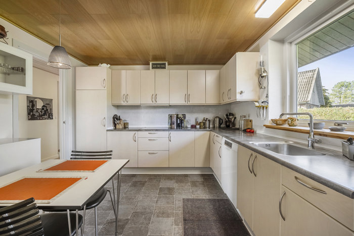 Når du træder ind, mødes du af et vindfang og en entré med garderobeniche. Herfra åbner boligen sig til en rummelig opholdsstue med hyggelig brændeovn og direkte udgang til både vest- og sydvendte terrasser. Stuen har en oplagt spiseafdeling i åben forbindelse til det funktionelle spisekøkken med lyse træelementer og god skabsplads.