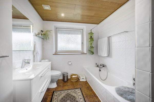 Via fordelingsgangen finder du et pænt badeværelse med kar, separat bruseniche og gulvvarme, et rummeligt soveværelse med skabsvæg samt to gode værelser – det ene med indbygget skab. Hertil kommer et praktisk bryggers med vaskefaciliteter og udgang til indkørslen.