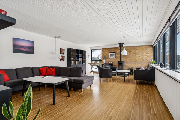 Køkkenet fra Vordingborg (2013) fremstår lyst og funktionelt og ligger i åben forbindelse med spiseafdelingen og den store opholdsstue. Her skaber det flotte lysindfald og den direkte udgang til den overdækkede terrasse en skøn sammenhæng mellem inde- og udeliv. Det store opholdsrum giver plads til både sofaafdeling og spisebord – et naturligt samlingspunkt for familien, hvad enten det er til hverdagsmiddage, lektielæsning eller hyggelige aftener med gæster.