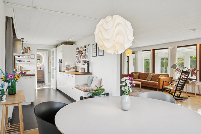 Velkommen indenfor til en gennemtænkt planløsning, hvor værelser og leverum er i hver deres ende af huset. Her skal du se et gæstetoilet og et badeværelse med natursten i marmor, et rummeligt og praktisk bryggers samt fire værelser. Boligens trumfkort er det glimrende leverum, hvor køkken-alrum og stue ligger i åben forbindelse til hinanden, hvilket skaber god plads til hverdagens samvær og årets festlige begivenheder.