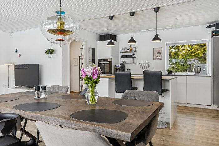 Villaen fremstår løbende vedligeholdt - her kan I flytte direkte ind uden bekymringer og i stedet fokusere på at skabe jeres eget hjem. Indretningen er både praktisk og indbydende: Et funktionelt bryggers med fjernvarmeinstallation og egen indgang giver god hverdagskomfort, mens det pæne køkken ligger i naturlig forbindelse med boligens store opholdsstue. Stuen byder på både spise- og opholdsafdeling med masser af lys og plads til hyggelige middage, afslappende aftener og gæster i weekenden.