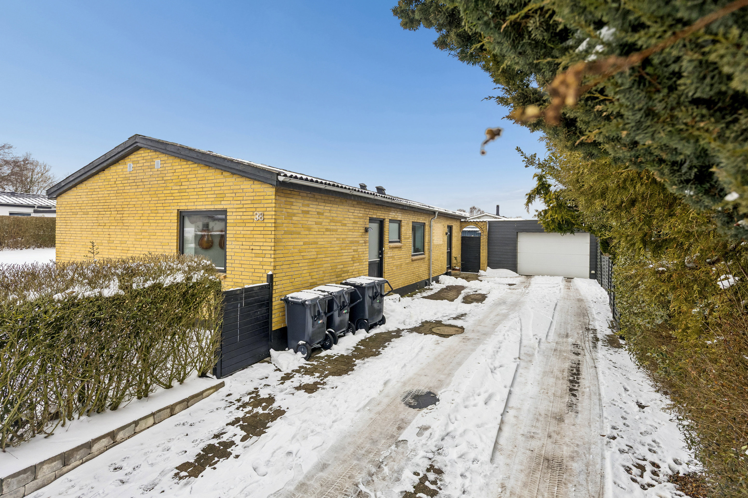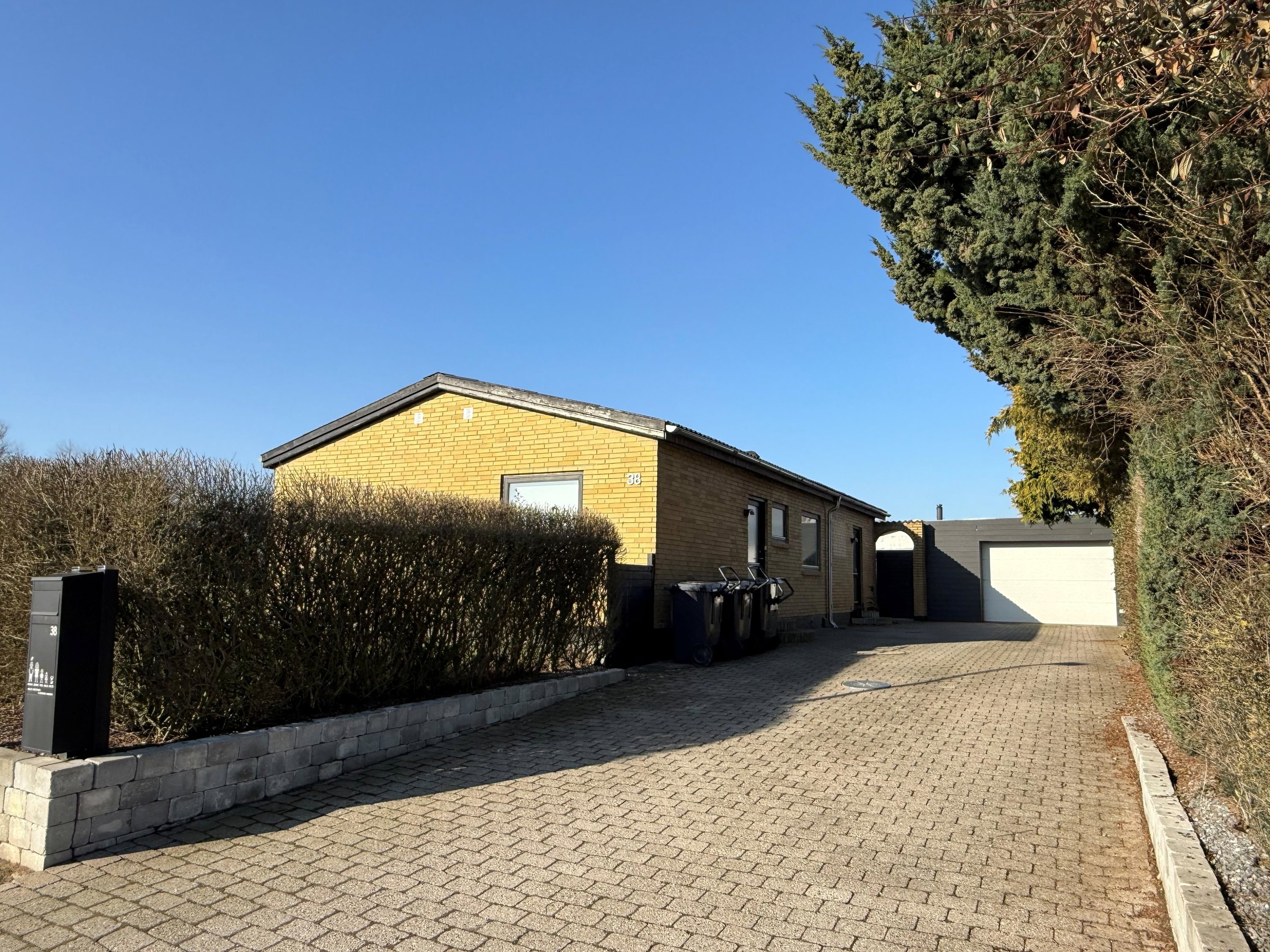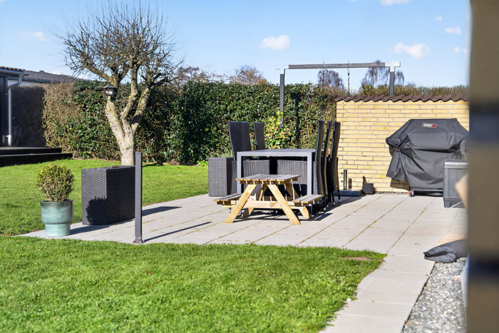 Udenfor venter en virkelig hyggelig, sydvestvendt have, hvor I kan nyde solen det meste af dagen. Den gode terrasse indbyder til lange, lune sommeraftener med grillen tændt, venner omkring bordet og ro i kroppen efter en travl uge. Til ejendommen hører også en solid garage på hele 30 m² med el-port – perfekt til bilen, opbevaring eller måske et lille hobbyværksted.
