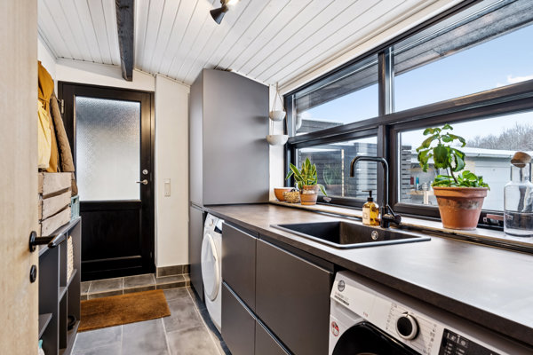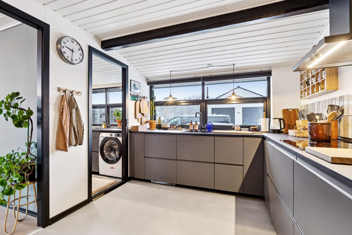 Køkkenet er et stilrent IKEA-køkken fra 2019, der fremstår moderne og funktionelt med god skabs- og bordplads. Her er et behageligt arbejdsrum med udsigt til forhaven, og i direkte forlængelse ligger bryggerset, som giver ekstra opbevaringsplads og plads til vaskefaciliteter – en stor fordel i en aktiv hverdag.