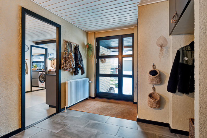 Boligen byder velkommen via entréen, som binder husets opholdsrum og værelsesafdeling naturligt sammen. Herfra træder du ind i den store, lyse stue, hvor de brede vinduespartier giver et skønt lysindfald og skaber en åben og behagelig atmosfære. Stuen rummer både spiseafdeling og opholdsstue og har direkte udgang til terrassen, så inde- og udeliv smelter naturligt sammen. I forlængelse af entréen ligger et praktisk disponibelt rum, der egner sig perfekt til opbevaring, hobby eller hjemmekontor.