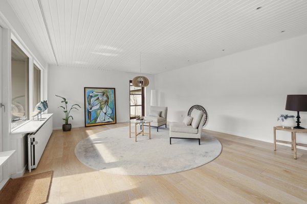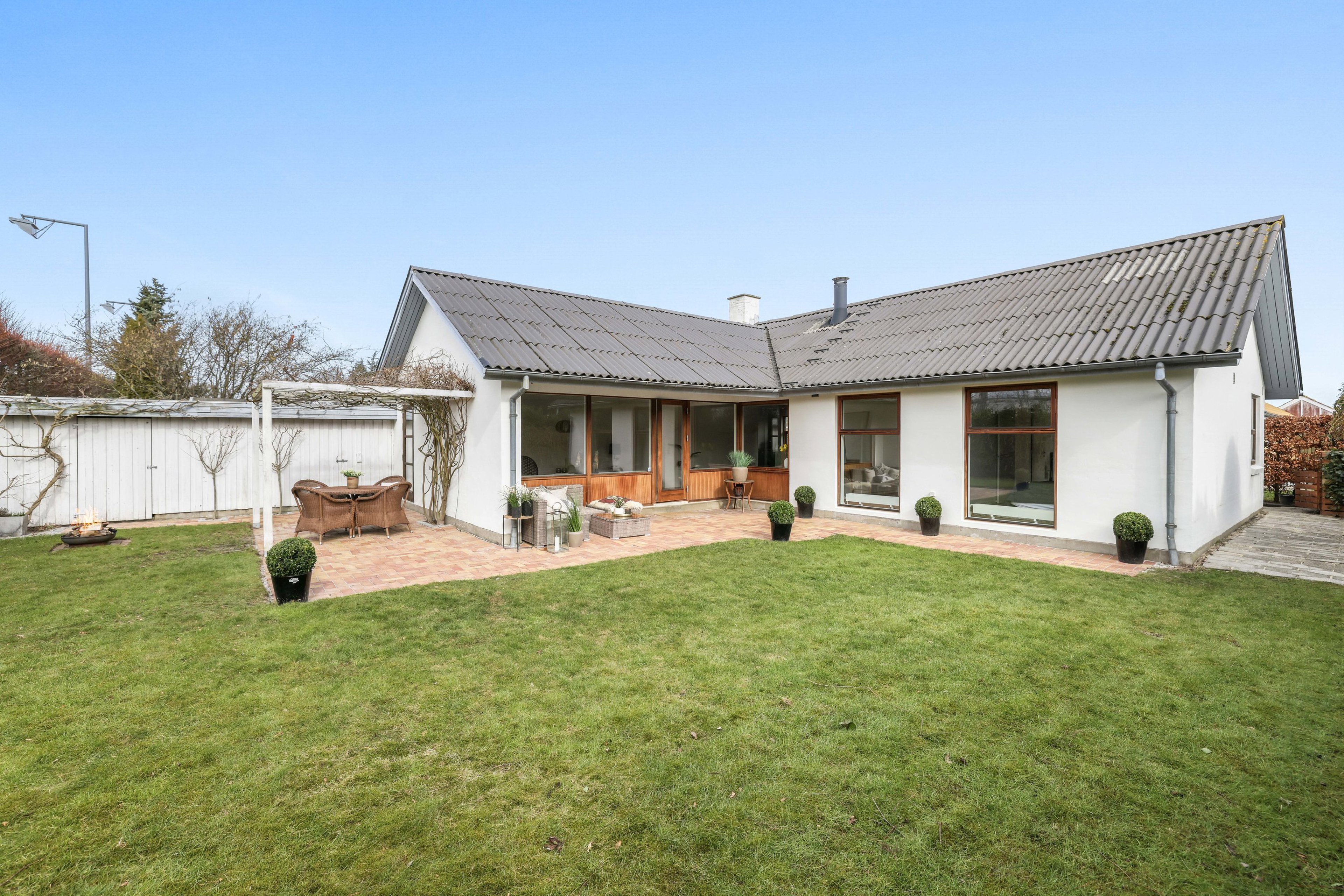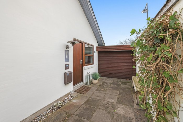 Villaen ligger tilbagetrukket og yderst privat med fine parkeringsforhold foran ejendommen, garage med port samt et praktisk udhus til opbevaring. Haven er en sand oase - ugeneret, solrig og perfekt til både afslapning og samvær i sommerhalvåret. Den sydvestvendte terrasse har en overdækket del, hvilket forlænger udesæsonen markant og gør terrassen anvendelig fra forår til langt ind i efteråret. Mod vest en pergola beplantet med en blåregn. Indenfor bydes du velkommen i en rummelig entré, der er elegant kombineret med bryggers. Her mødes man af et smukt kinesisk skiffergulv samt god skabs- og bordplads, der gør hverdagen både funktionel og stilfuld. Boligens naturlige samlingspunkt er det imponerende køkken-alrum og stue, der flyder harmonisk sammen i ét åbent og lyst rum. Store vinduespartier sikrer et fantastisk lysindfald dagen igennem, og de flotte lamelplankegulve understreger boligens varme og eksklusive udtryk. I stuen skaber brændeovnen en helt særlig stemning og bidrager med både hygge og varme. Rummet er let at indrette. Herfra er der direkte adgang via glasdør til terrassen og haven, så inde- og udeliv smelter naturligt sammen. Køkkenet er åbent og funktionelt med god skabs- og bordplads, perfekt til både hverdag og gæster. Boligen rummer desuden to lyse børneværelser med skabe. Et stort soveværelse med elegant firefløjet skabsvæg. I to af værelserne giver gulv-til-loft-vinduespartier et smukt kig til haven og inviterer lyset helt ind i rummene. Badeværelset er nyere og det fremstår lækkert med en glasbruseniche, et stilrent vaskearrangement, smukke klinker, gulvvarme samt et karakterfuldt vinduesparti inspireret af asiatisk byggekultur.