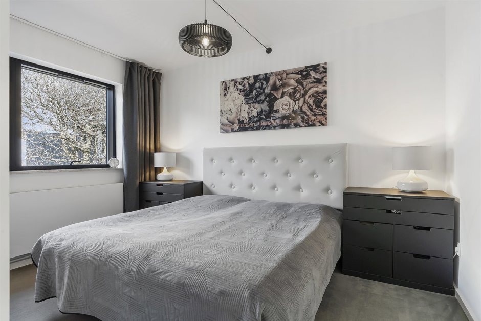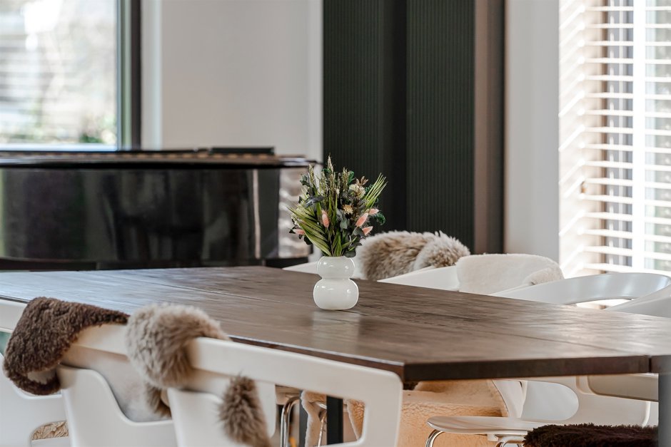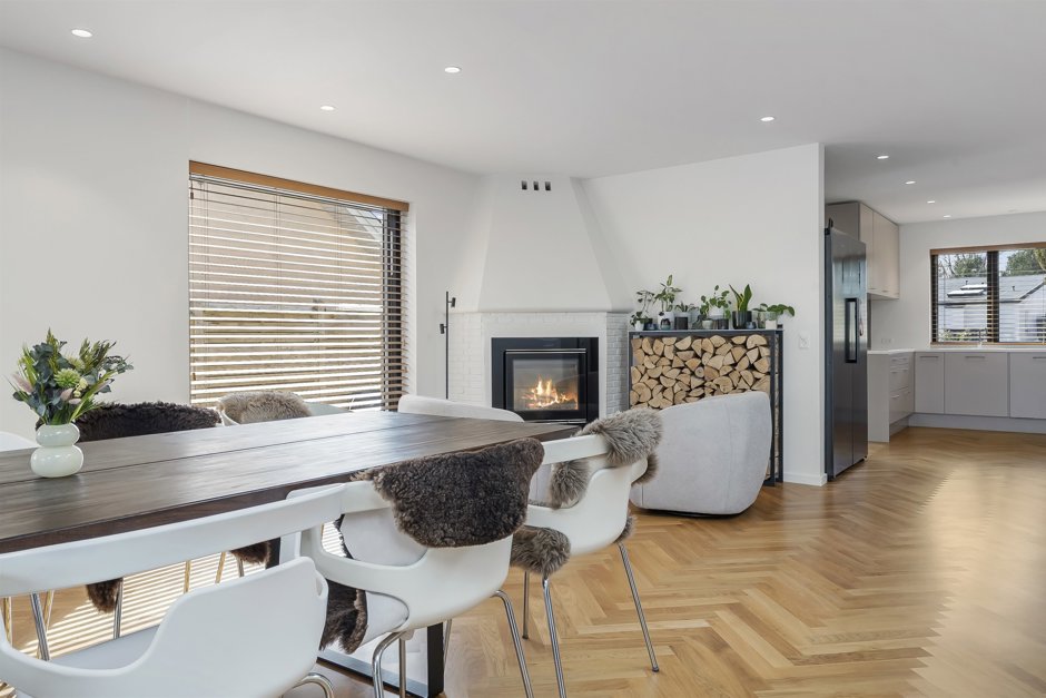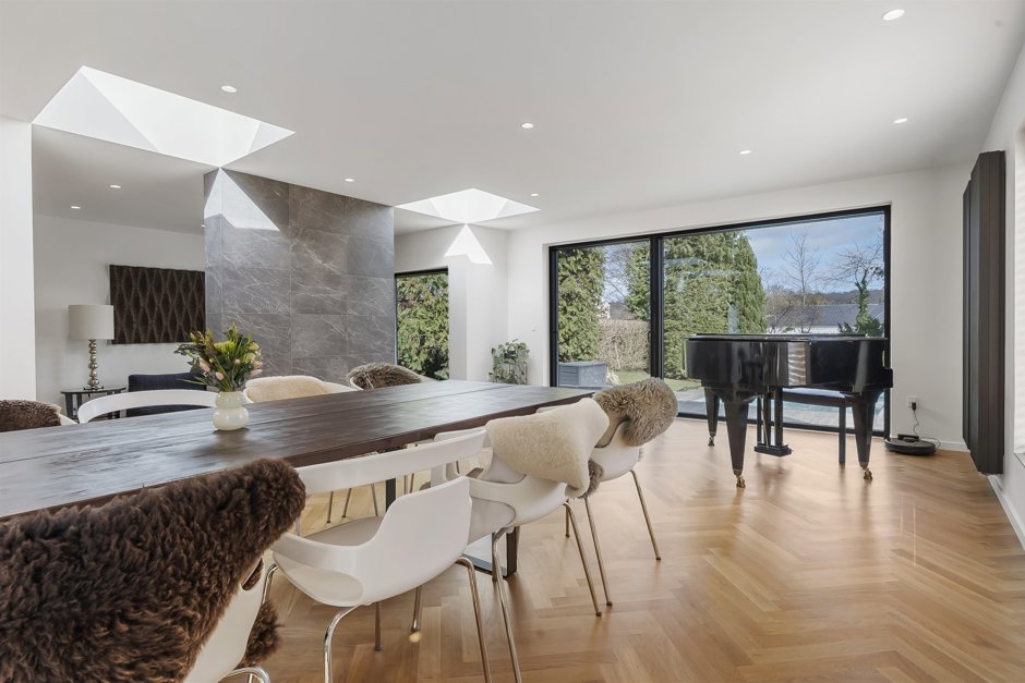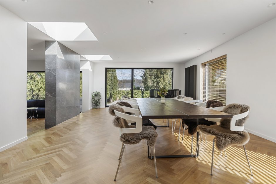 Hjertet i huset er det åbne køkken-alrum, hvor det neutrale køkken smelter diskret ind i omgivelserne og lader de rene linjer og det arkitektoniske udtryk stå skarpt. Herfra åbner rummet sig mod en imponerende spisestue med pejs og hyggeligt opholdsområde – et oplagt samlingspunkt for både hverdag og gæster.