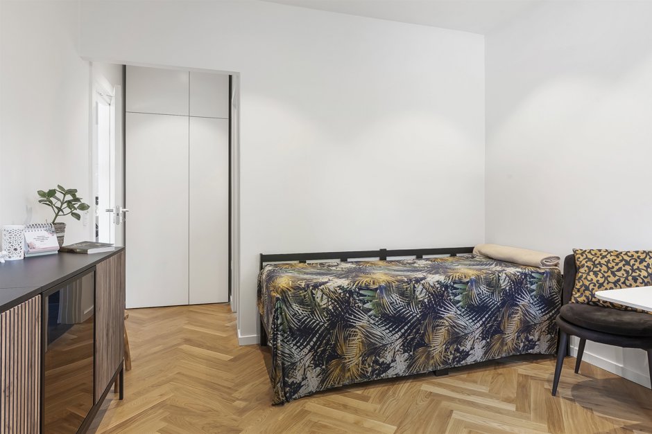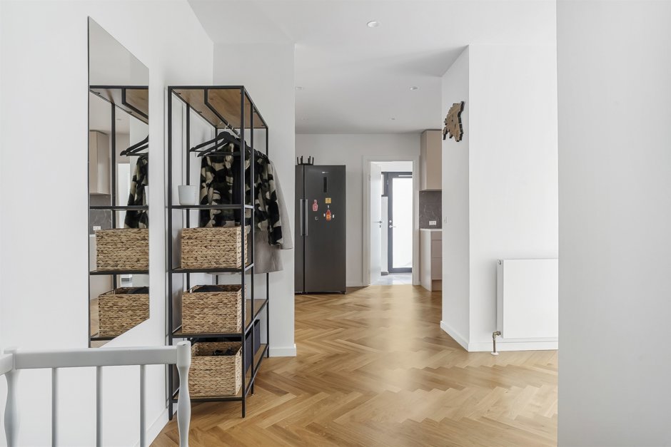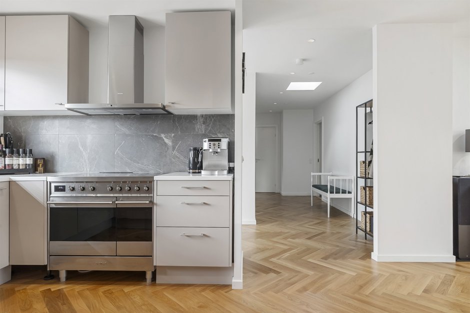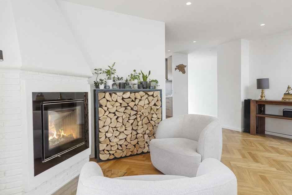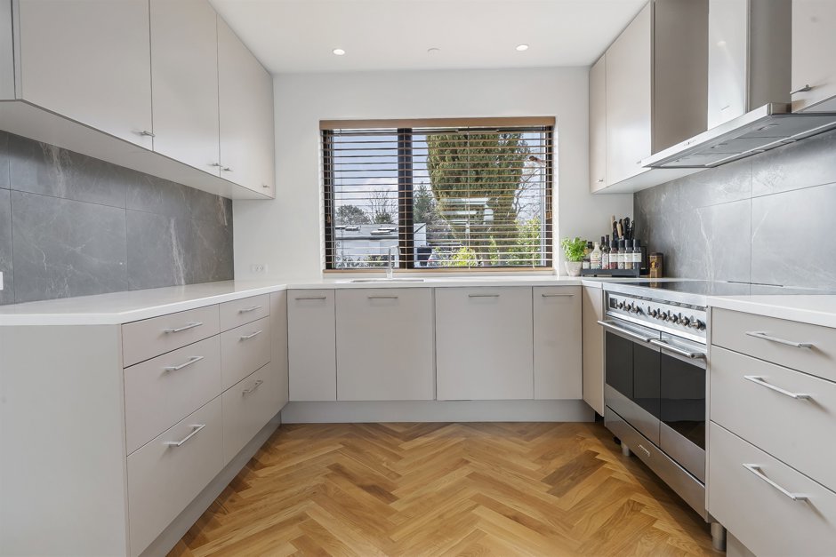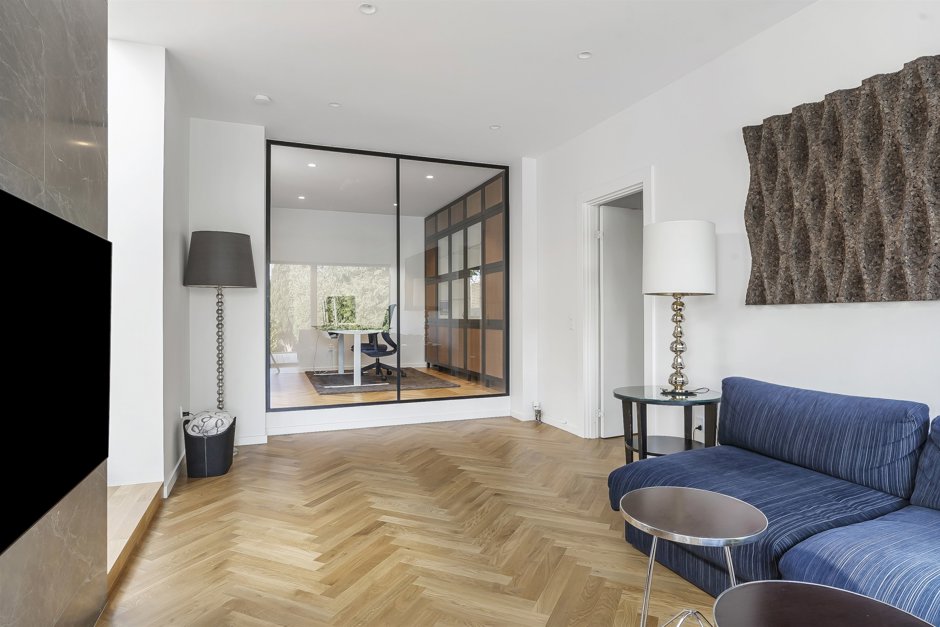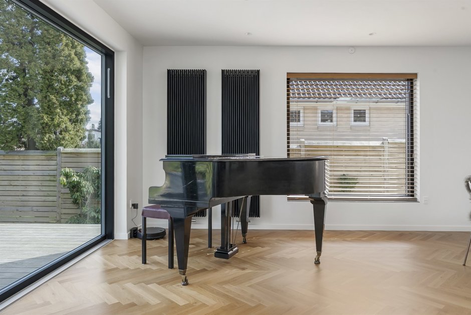 Her får du et smukt og totalistandsat hus, hvor en arkitekt har sat sit tydelige præg med stilrene løsninger og en rød tråd i både materialevalg og indretning. Boligen fremstår indbydende og harmonisk med elegante sildebensparketgulve, der løber gennem hele hjemmet og understreger den eksklusive atmosfære.