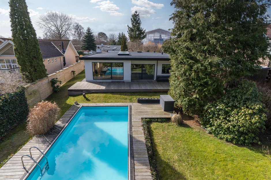 Udendørs venter en skøn og velanlagt have med smuk beplantning, der smyger sig omkring både terrasser og pool område og skaber en fredelig oase med flere opholdszoner.