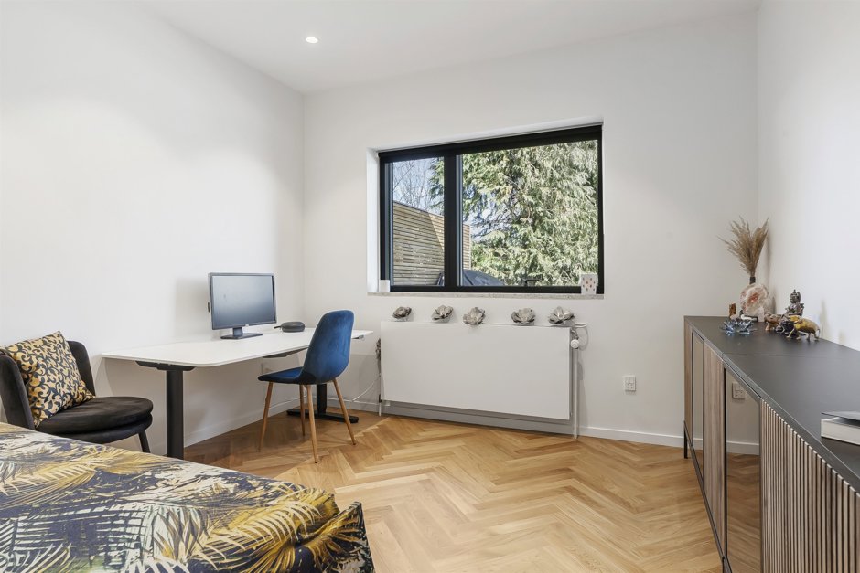 Fra stuen tilgås en privat forældreafdeling med soveværelse og eget badeværelse. Fra spisestuen er der etableret et karakterfuldt værelse – i dag indrettet som kontor. Den rummelige entré giver adgang til yderligere to gode værelser samt endnu et stilrent badeværelse. Fra køkkenet er der desuden adgang til et stort, praktisk og flot bryggers.