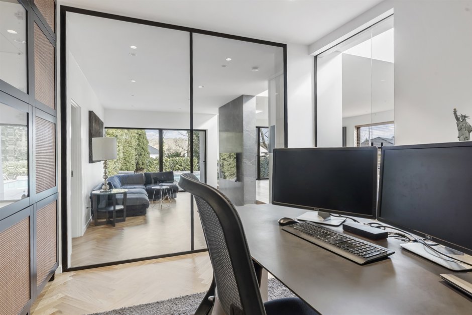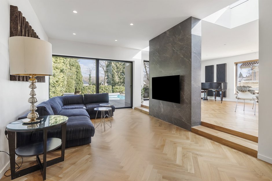 Et trin ned finder du den stilfulde stue, som er delvist opdelt af en elegant midte væg, der skaber en naturlig opdeling uden at lukke rummet. De store ovenlysvinduer, samt gulv-til-loft vinduer og brede skydedøre i både stue og spisestue, sikrer et fantastisk lysindfald og en flydende overgang mellem inde og ude – med direkte udgang til en flot træterrasse. Herfra fortsætter udelivet naturligt videre til det indbydende pool område, som ligeledes er omgivet af en smuk træterrasse og elegant beplantning, der skaber en privat og eksklusiv atmosfære.