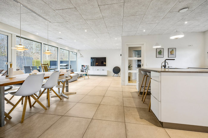 Indretningen byder på 2 gode værelser, soveværelse med walk-in-closet samt kontor. Herudover et helt fantastisk, åbent køkken/alrum i forbindelse med stuen, hvor store vinduespartier skaber et skønt lysindfald og udsigt til den grønne have. Køkkenet er stilrent og moderne med god skabs- og bordplads