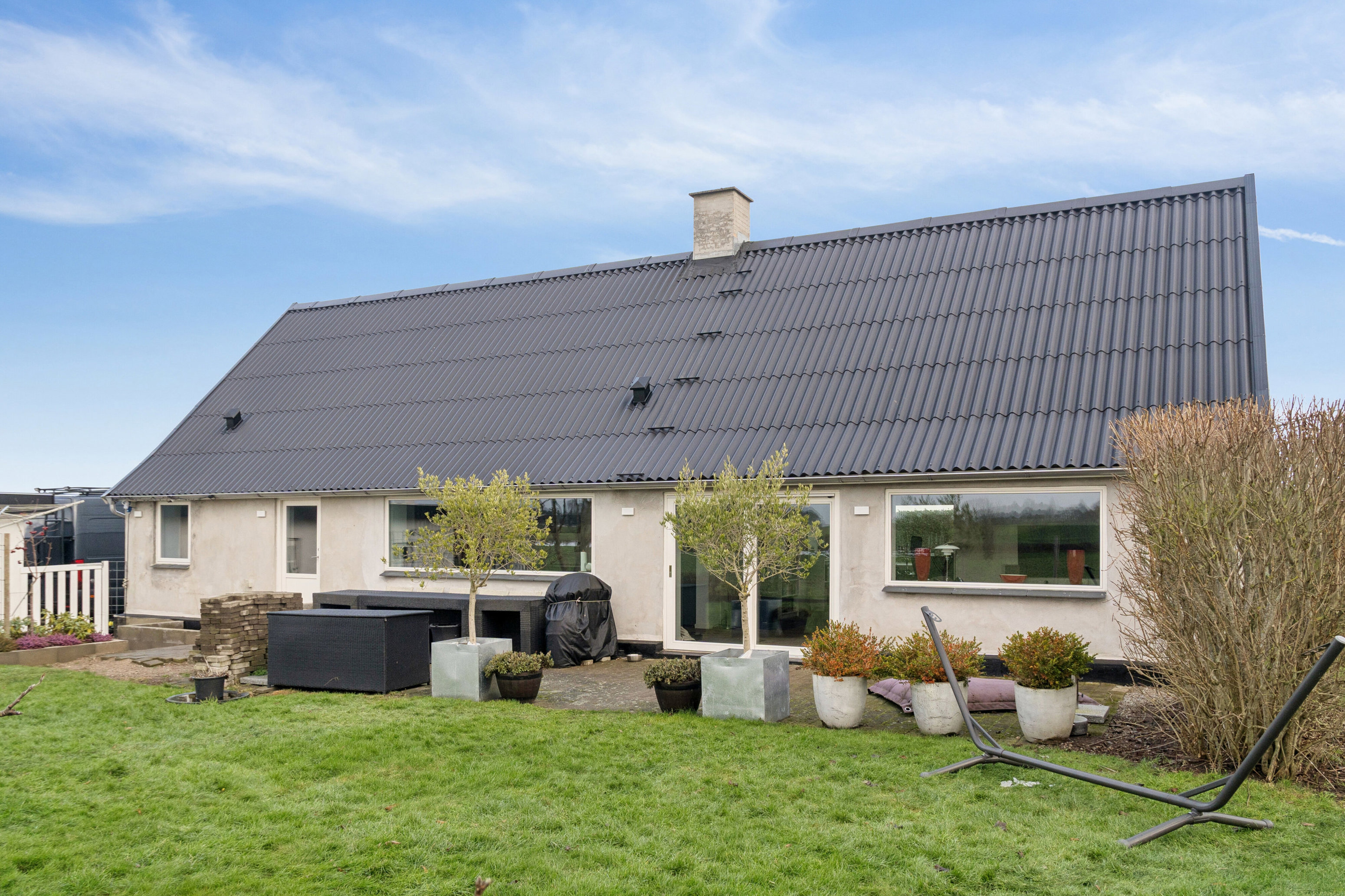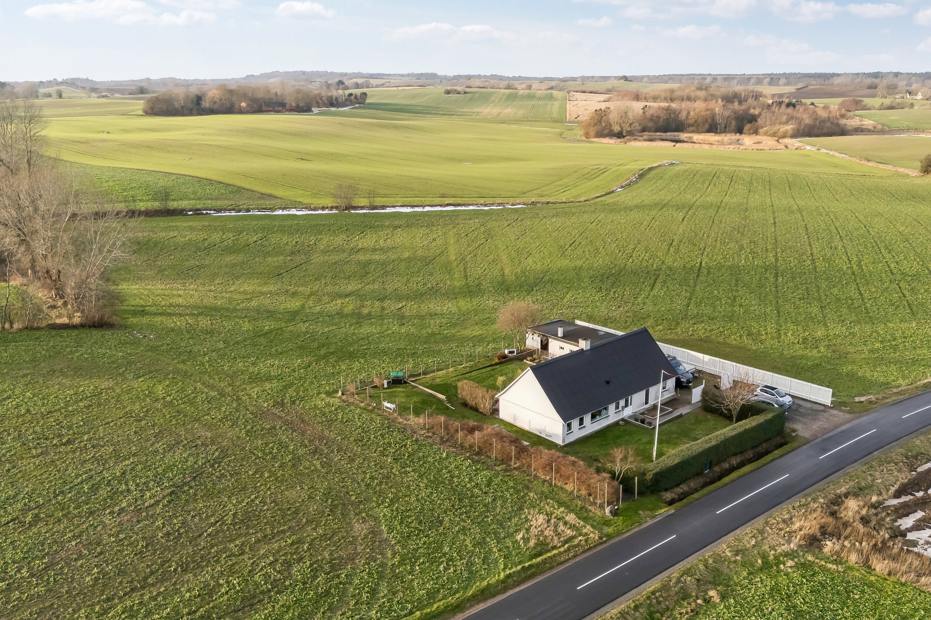 Ejendommen ligger tilbagetrukket fra vejen side om side med en bred indkørsel og en praktisk udbygning. Haven omkranser også villaen og grænser op til markerne, og der er rigeligt plads til alskens havedrømme, leg og afslappende stunder.