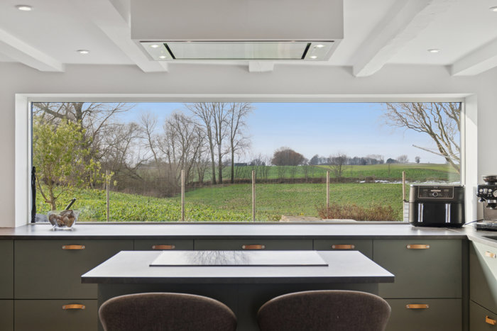 Rumfordelingen i boligen er velovervejet, og det fremgår især af det store køkken-alrum i midten, som er i åben forbindelse med vinkelstuen og udgør boligens åbne opholdsrum. Selve køkkenet er stilrent og moderne, og kogeøen med bardisk vidner om rummets funktion som samlingssted.