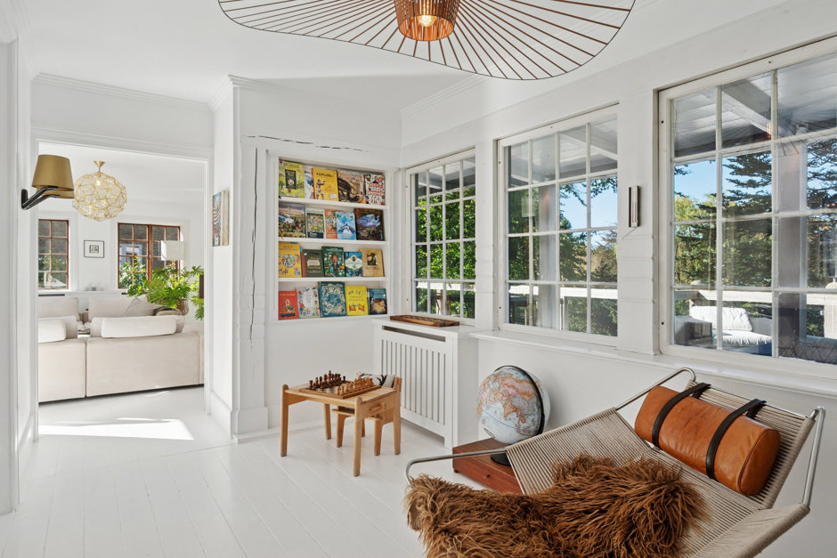 Den tilstødende spisestue har plads til hele familien og smukt udsyn til baghavens trætoppe. Franske døre forener spisestuen med den lyse sofastue, der har indbygget bogreol og en stor indbygget pejs.