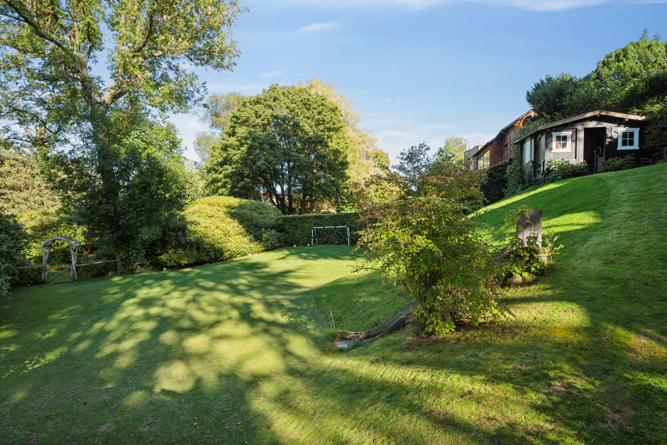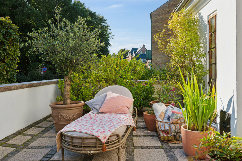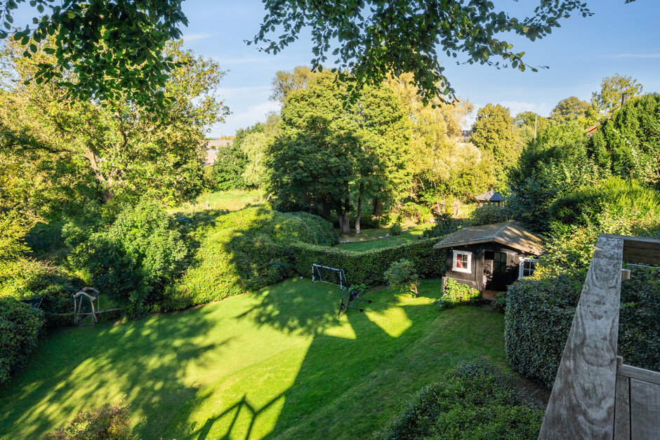 Ejendommens romantiske forhave udgøres af forskudte fliseterrasser med lavendelbede og rosenbuske. Det er bag huset, man får glæde af den ugenerede træterrasse og den mageløse udsigt direkte ind i trætoppene og hen over den kuperede baghave og Bakkehusets lille park, der grænser op til grunden.