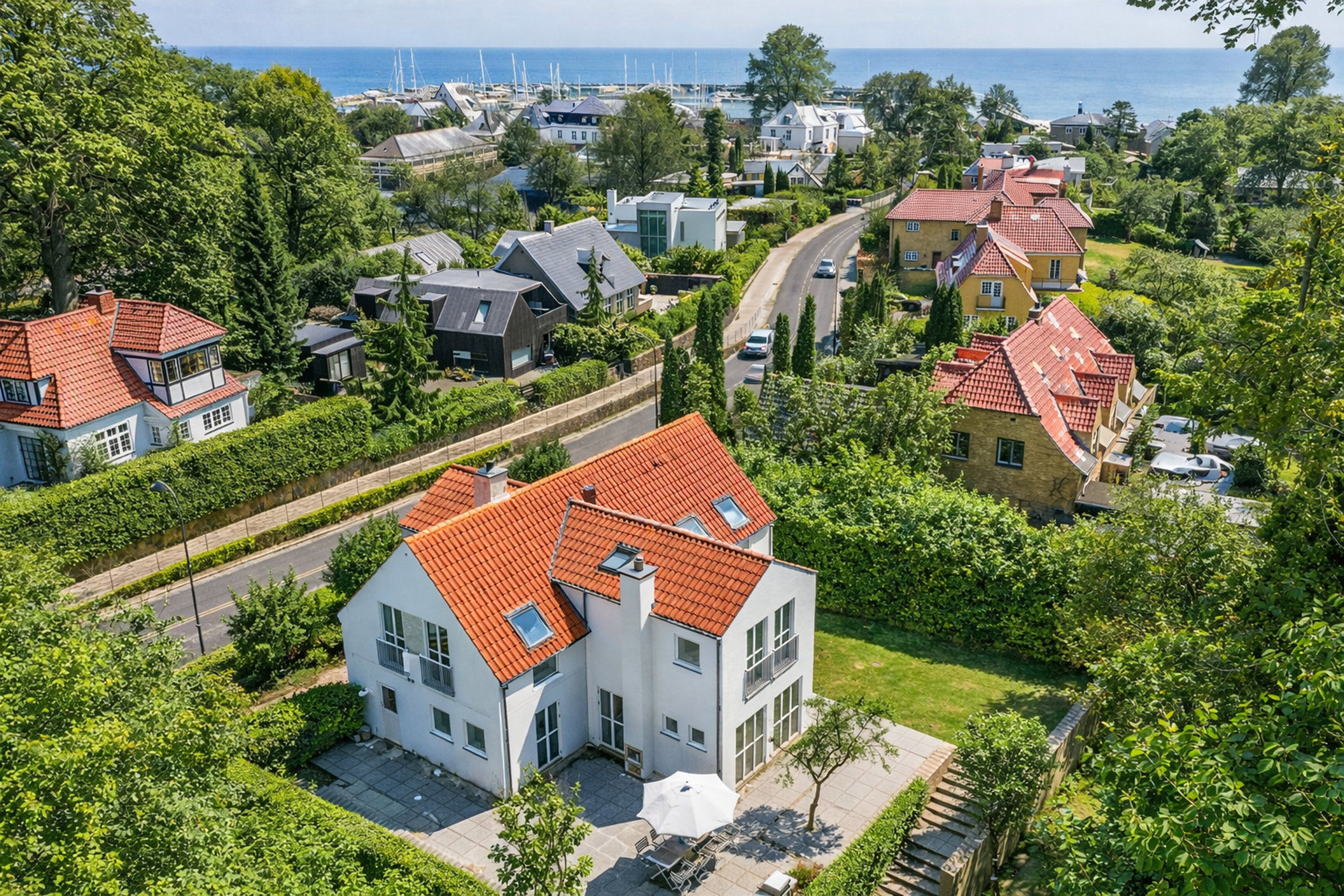 Her i Vedbæk, hvor Øresund viser sig fra sin mest rolige og dragende side, og hvor kystens liv leves i et tempo, der sjældent findes tættere på hovedstaden, ligger Trørødvej 21. Kun ganske få rækker fra vandkanten – og alligevel med skovens grønne dyb i baghaven – finder I en villa, hvor beliggenhed og bolig går op i en sjældent set helhed.
