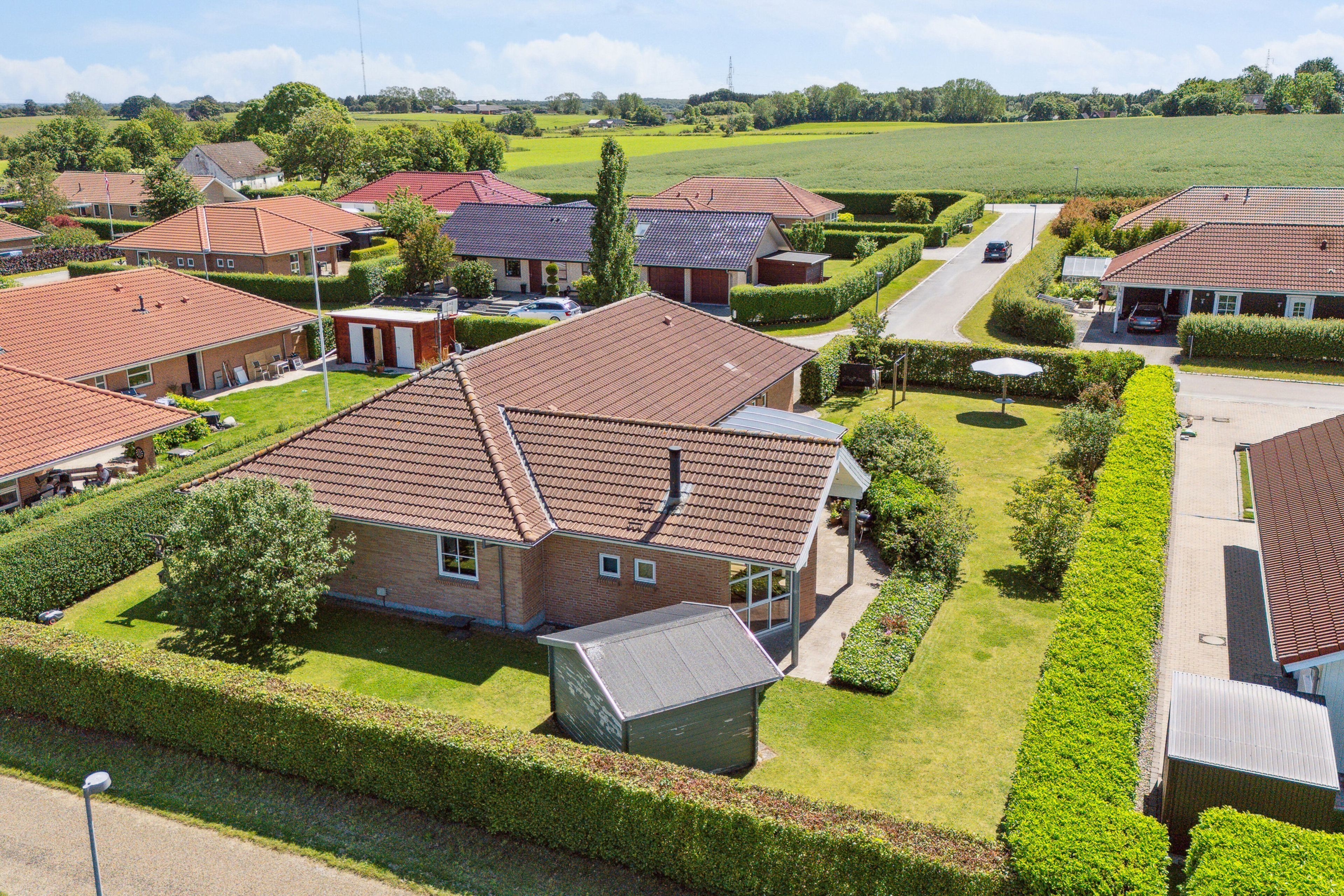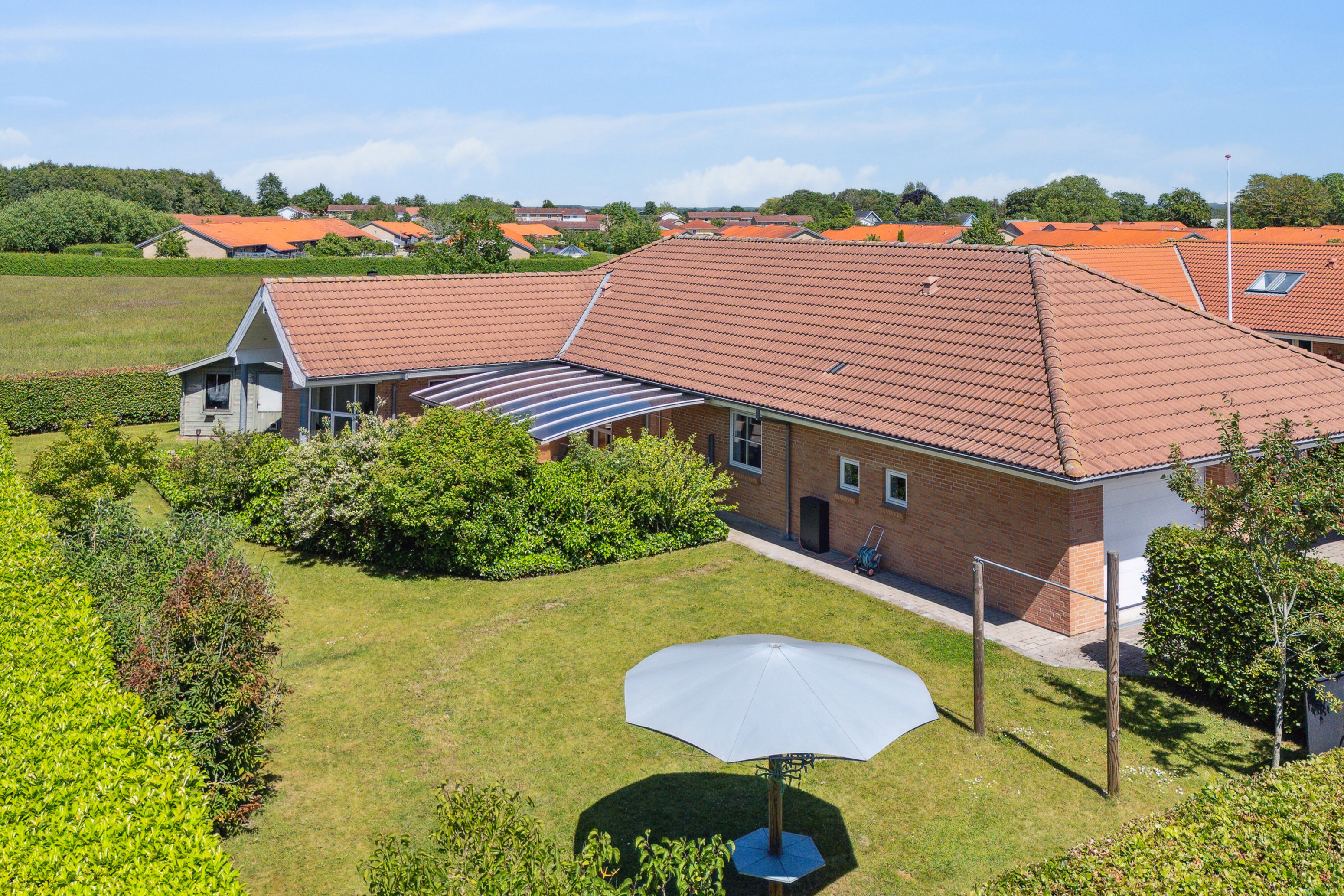 Udenfor finder du en rummelig indbygget carport på 37 m2, samt garage på 27 m2.