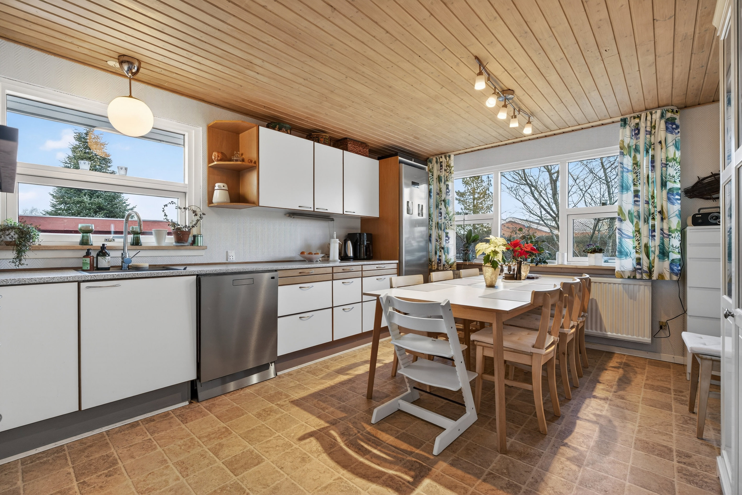 Det er selvfølgelig de indre værdier, der tæller, og boligen nyder godt af relevante opdateringer af alle de vigtigste rum. Det gælder ikke mindst køkkenet, som byder på skabsinventar med hvide fronter og i øvrigt er et stort spisekøkken med rigelig plads til at dække op – også når I har gæster. I den forstand er det en lille luksus, at der ikke er åben forbindelse til stuen, som ligger ved siden af og byder på rigtig god plads.