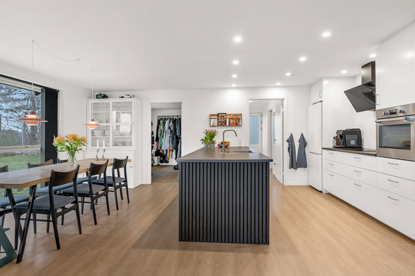 Husets boligareal er på 114 m2, og rummer en fin entré med praktisk og flot klinkegulv, dejligt badeværelse med rummelig bruseniche, husets første værelse har man ligeledes adgang til fra entréen. Dernæst kommer man ind i det store åbne køkken/alrum med et godt lysindfald fra de store gulv-til-loft vinduer med syd og vinduer mod vest. Fint køkken i hvide elementer og med praktisk køkken-ø med vask. Huset rummer yderligere et værelse, praktisk bryggers ligeledes med hvide elementer samt soveværelse.