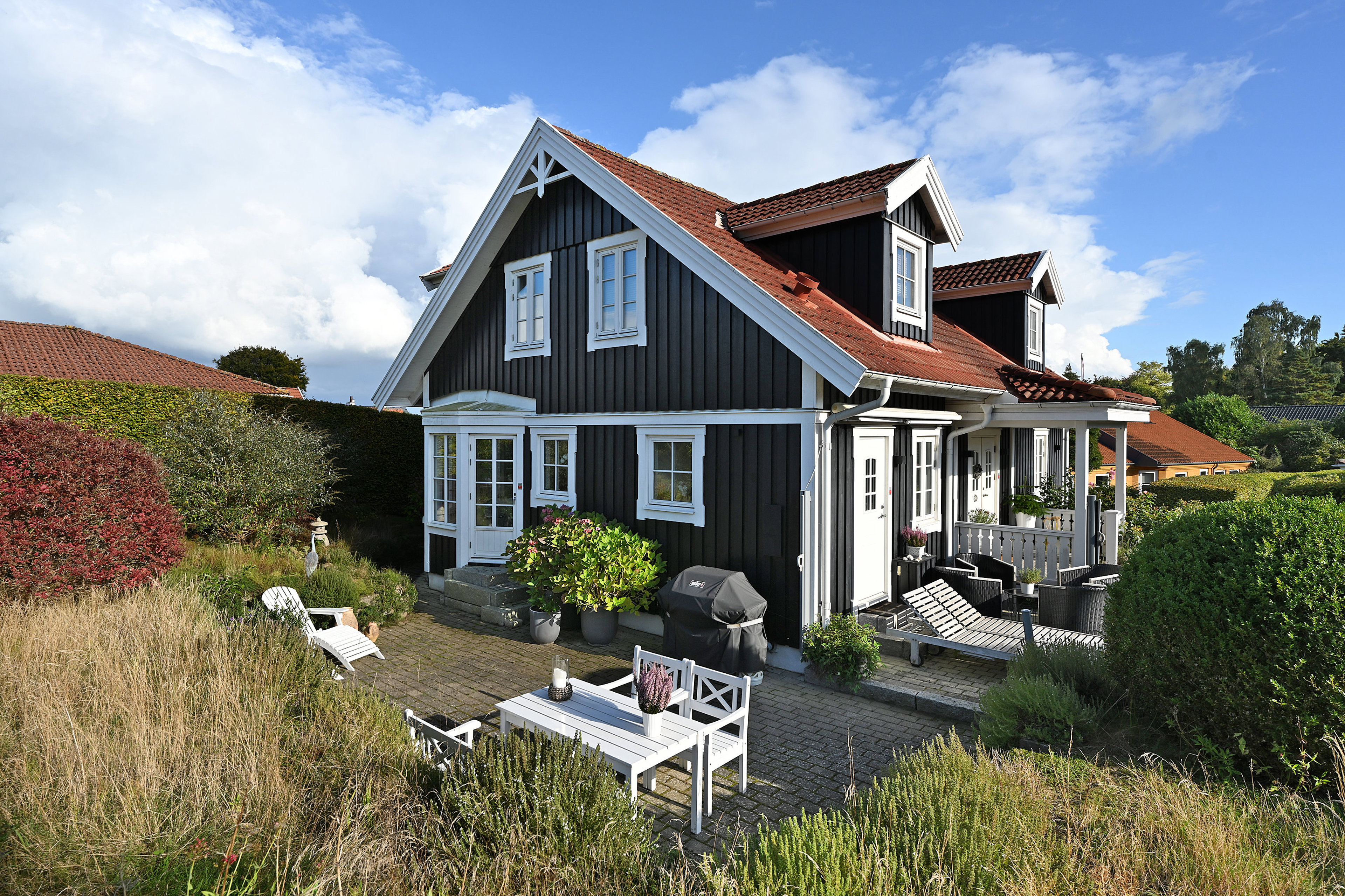 Villaen er højt beliggende på grunden og der er derfor masser af lys og luft omkring, ingen indblik fra naboer og lignende samt helt stille, da Strandvejen ligger 4 huse væk og dermed er der kun fuglefløjt i vente når I skal nyde den skønne oase af en have med smukke gamle æbletræer, buske og den fine grønne græsplæne samt rislen fra vandet i det elegante havebassin. I kan også glæde jer til, at sidde på terrassen det kommende forår og sommer og nyde solens varme stråler, roen og de læfyldte kroge med familie og venner, der alle med garanti vil glædes over jeres nye hjem!