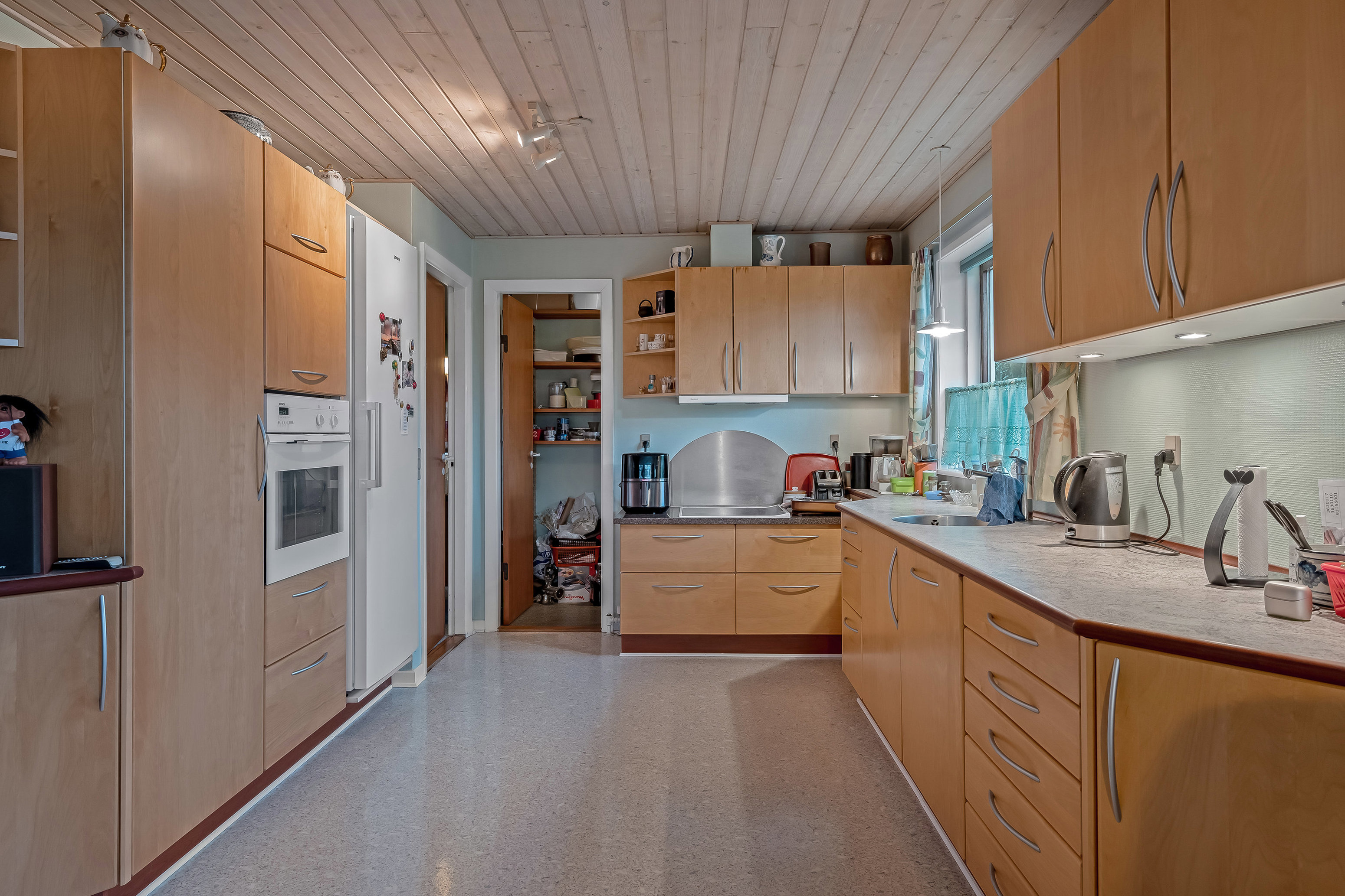 Til venstre for entréen findes et funktionelt bryggers med god plads til vaskefaciliteter og opbevaring - en praktisk løsning i hverdagen. Herfra fortsætter boligen naturligt ind i det lyse og indbydende køkkenalrum, som udgør hjemmets hjerte. Køkkenalrummet har en åben forbindelse til stuen, som skaber et skønt opholdsrum med plads til både madlavning, samvær og afslapning.