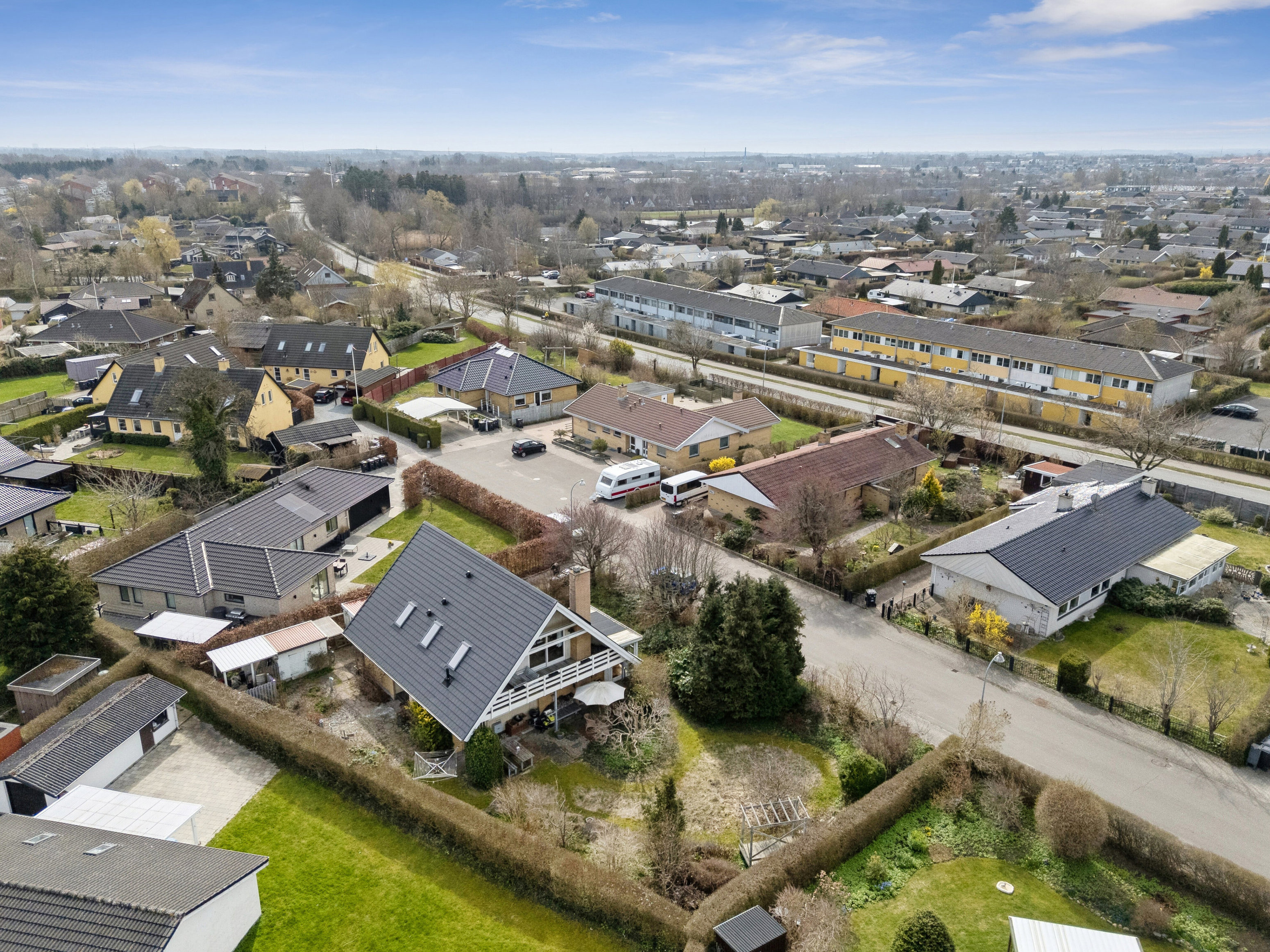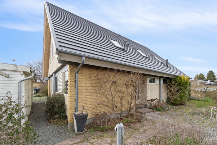Villaen er et klassisk A-hus med tilhørende carport, skur og en overdækket terrasse. Der er således gode parkeringsforhold, og haven, der orienterer sig mod nord, syd og vest, er anlagt med plads til både leg og afslapning på henholdsvis plæne og den delvist overdækkede terrasse. Ejendommen fremstår funktionel med flere udgange til ejendommens terrasser, hvilket giver mulighed for hurtigt at søge mod solen, når den skinner.