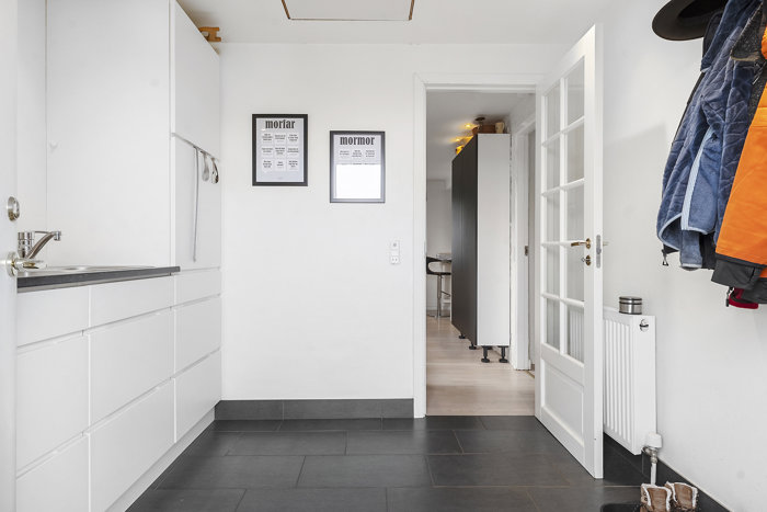 Boligen byder velkommen via et praktisk bryggers med plads til både vaskefaciliteter og opbevaring, et oplagt hverdagsindgangsparti for familien. Herfra er der adgang til boligens fordelingsgangen, der binder husets rum godt sammen.