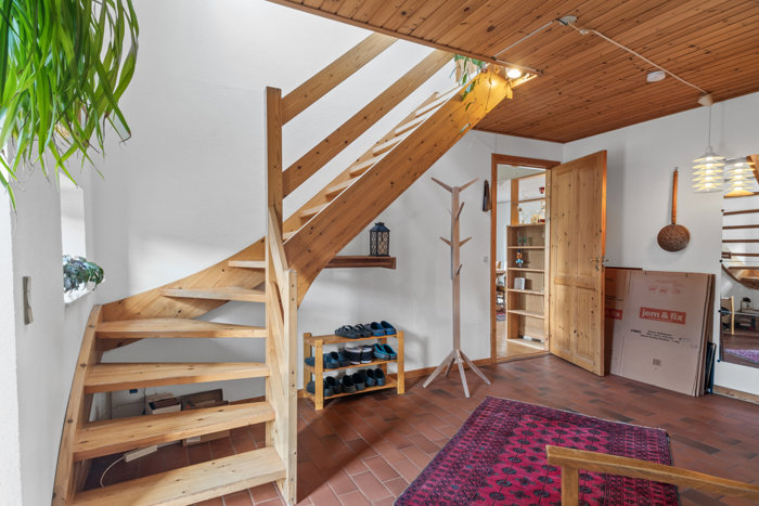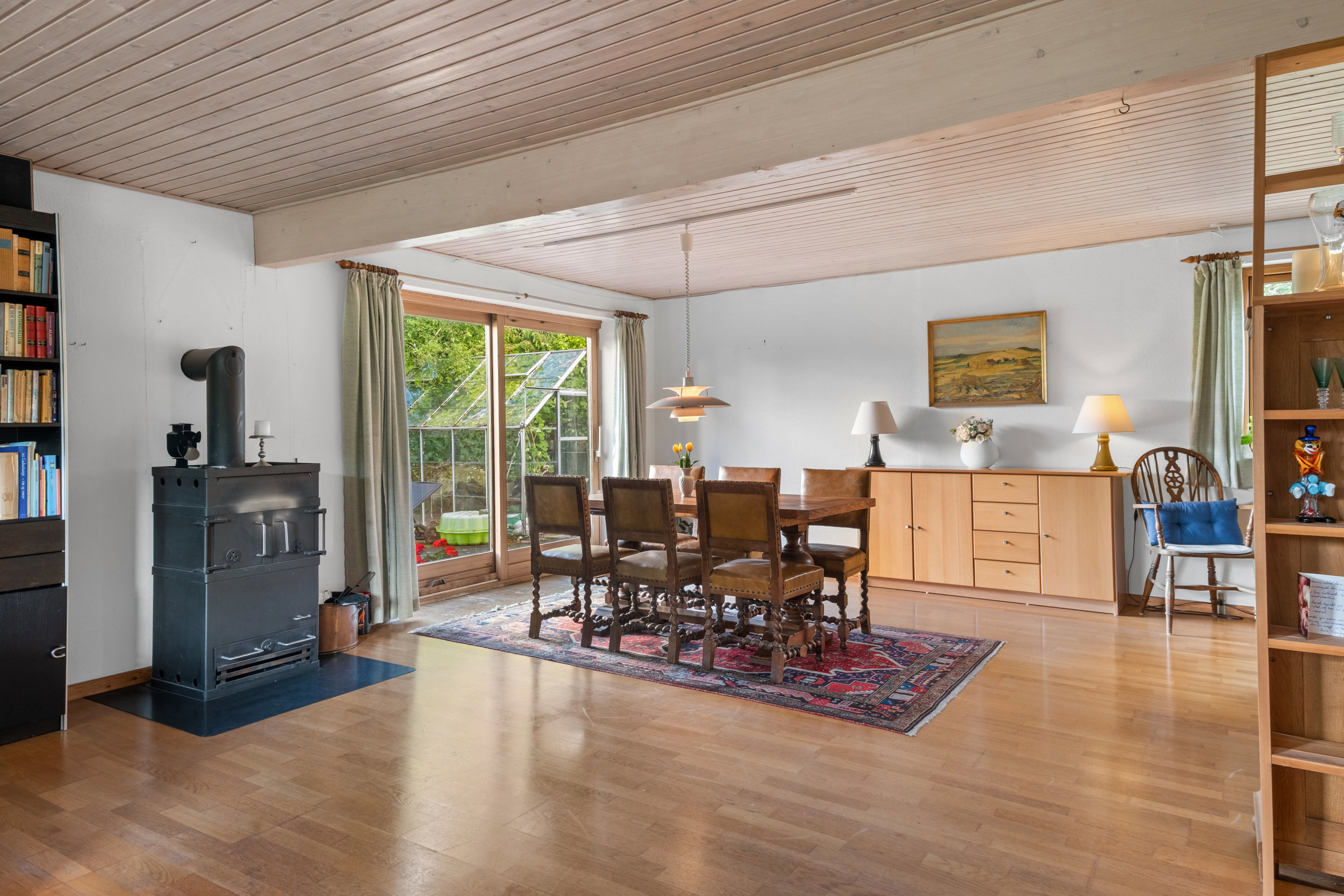 Boligen byder på en åben entré med adgang til husets ene badeværelse, stuen og videre ind til et velindrettet spisekøkken med direkte forbindelse til den store spisestue og opholdsstue. Her er der brændeovn, store vinduespartier og direkte udgang til en solrig, ugeneret have, der indbyder til både leg og afslapning. Der er også adgang fra carporten ind til bryggerset som fører dig videre ind i køkkenet.